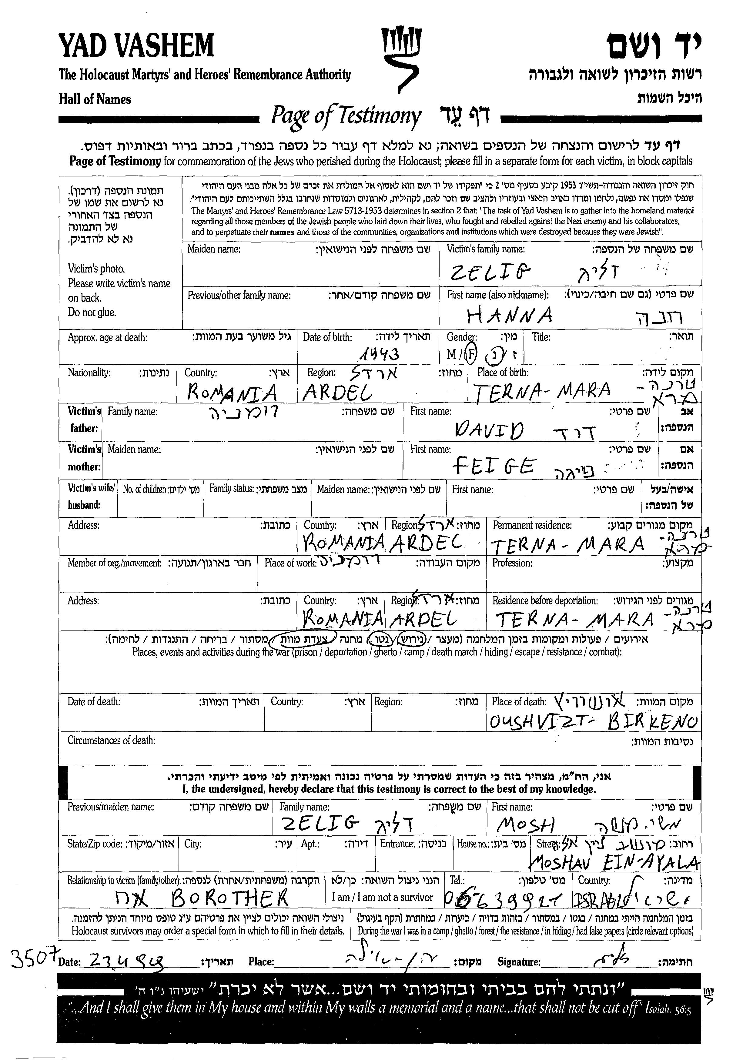 Zelig Hanna 1943 Tarna Mare, Roumanie Feuille de témoignage