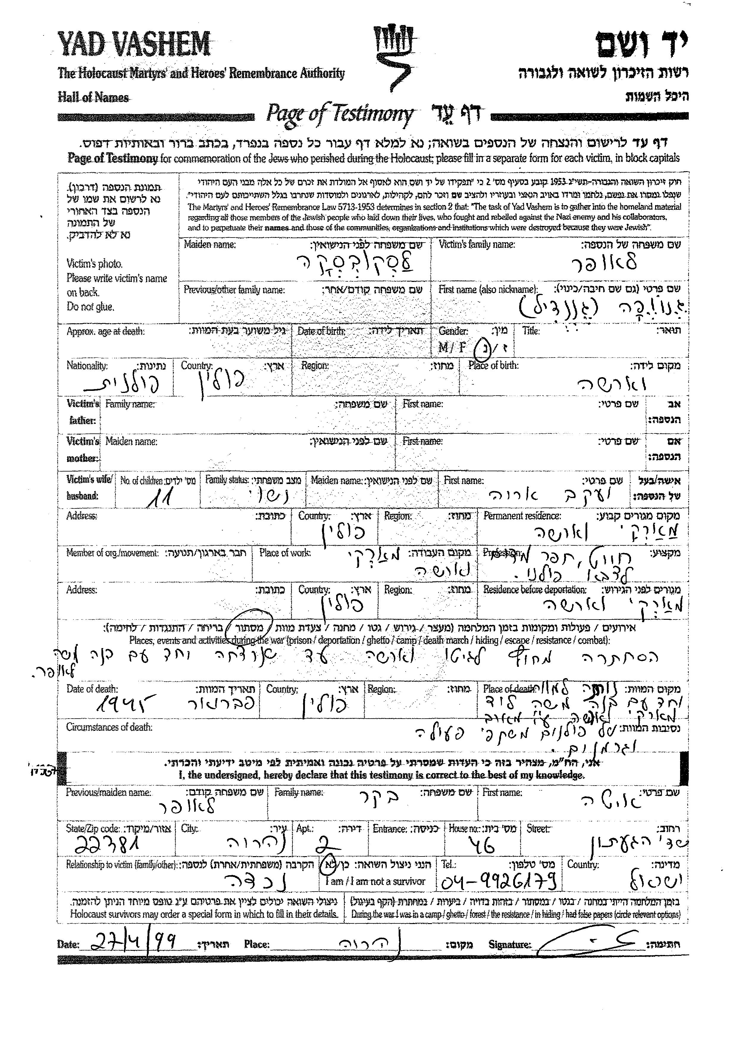 Yad Vashem - Pages of Testimony Names Memorial Collection