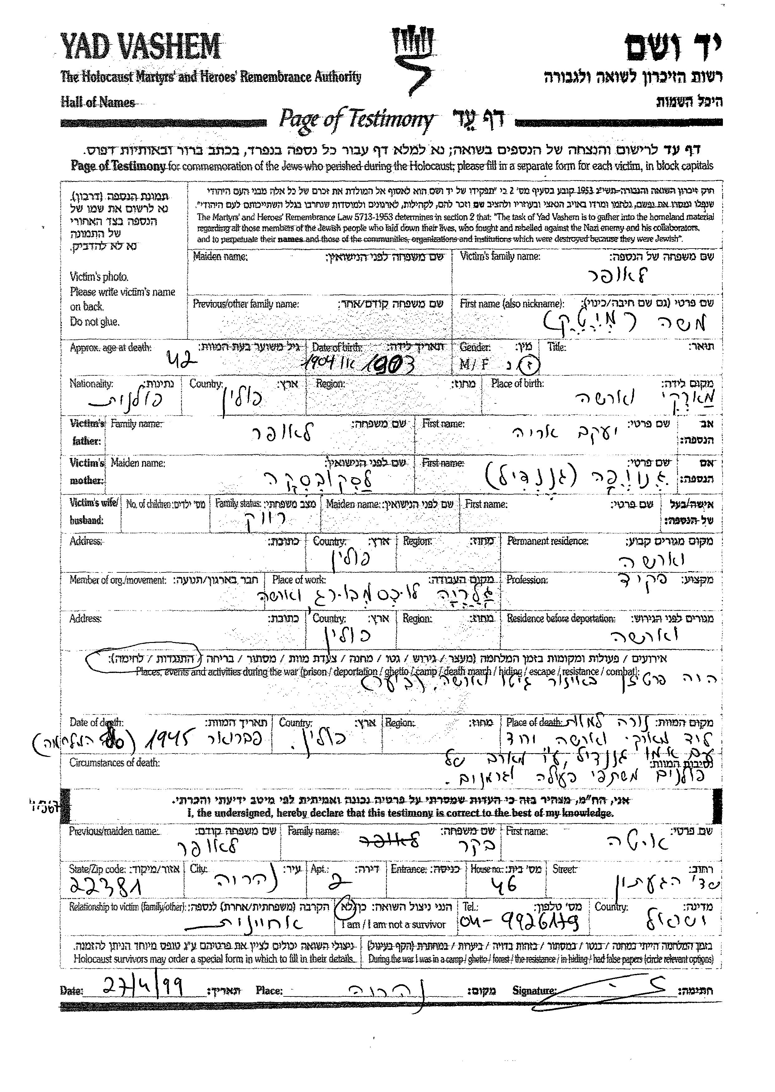 Laufer Moshe Miechislav 1903 Warszawa, Pologne Feuille de témoignage