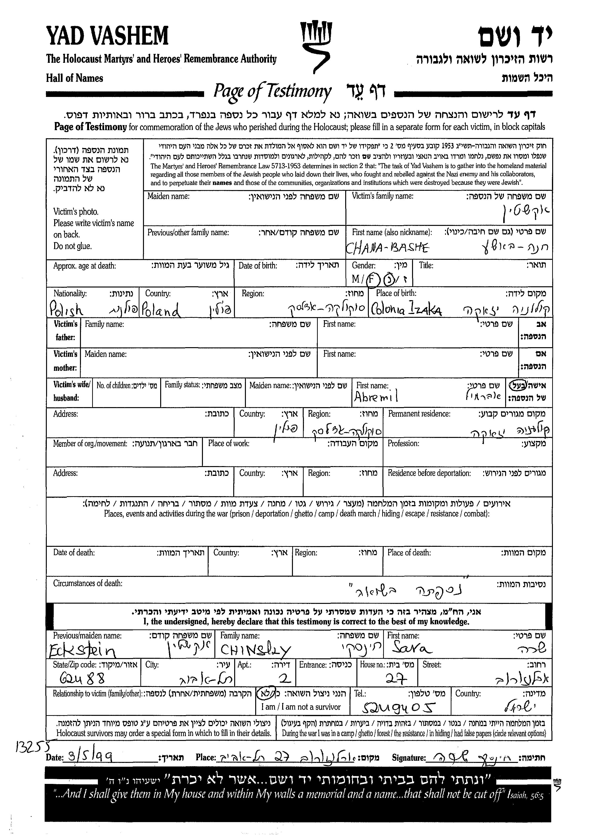 Ekshtein Chana Bashe Colonia Isaaca, Pologne Feuille de témoignage
