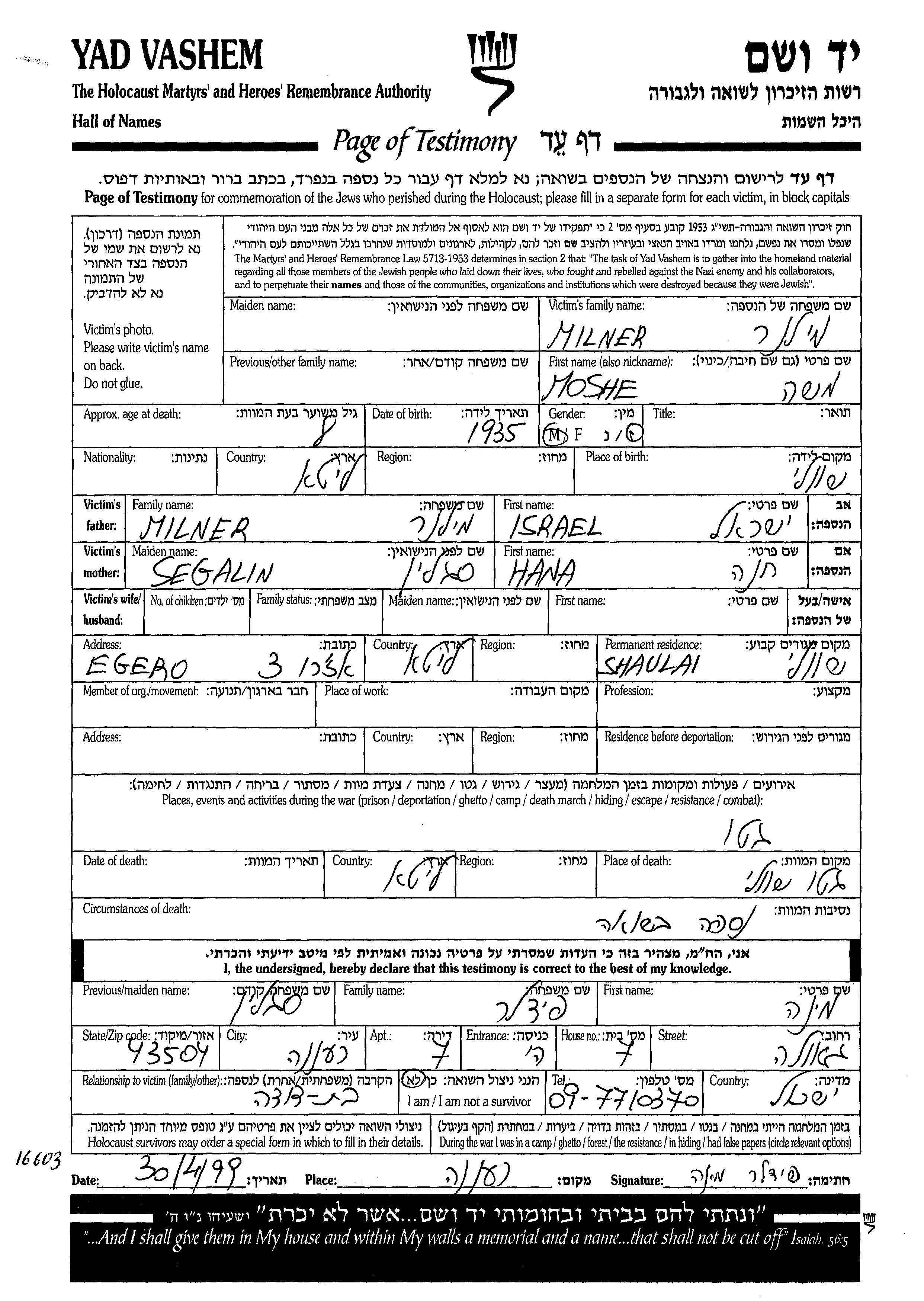Milner Moshe 1935 Shauliai, Lituanie Feuille de témoignage