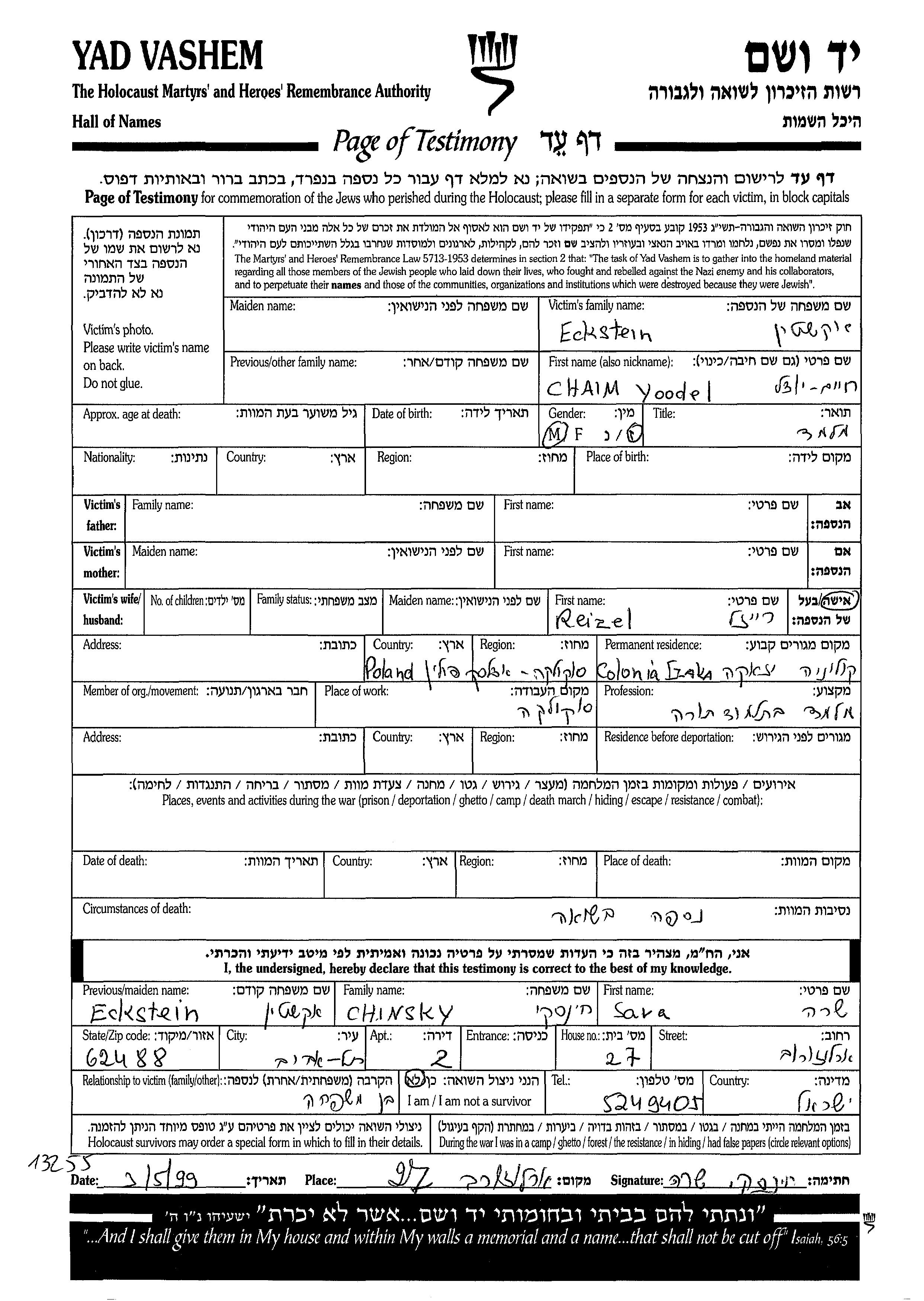 Eckstein Chaim Yoodel Colonia Isaaca, Pologne Feuille de témoignage