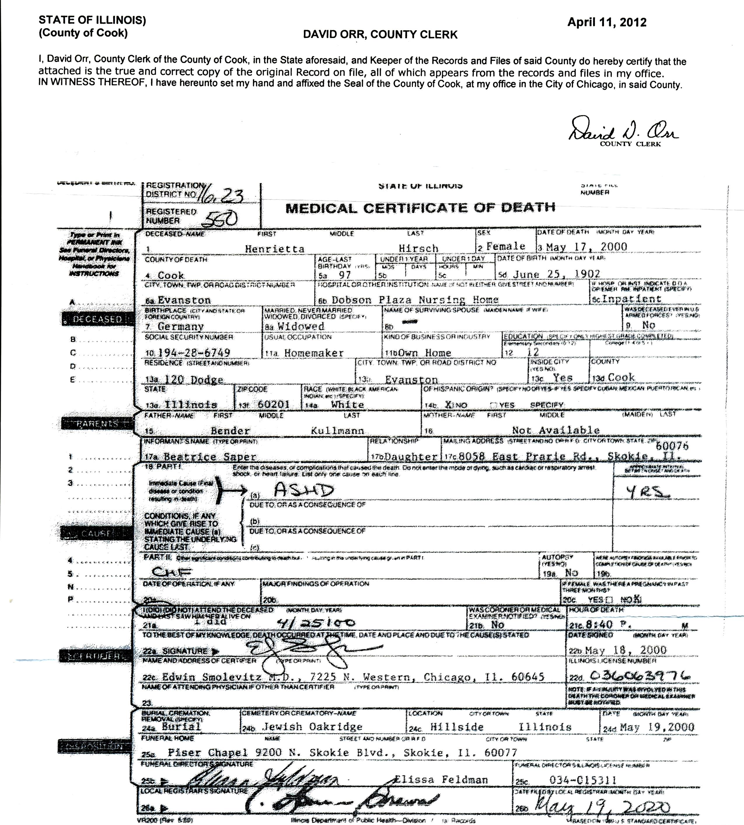 Hirsch Henriette 1902 Frankfurt am Main, Allemagne Feuille de témoignage