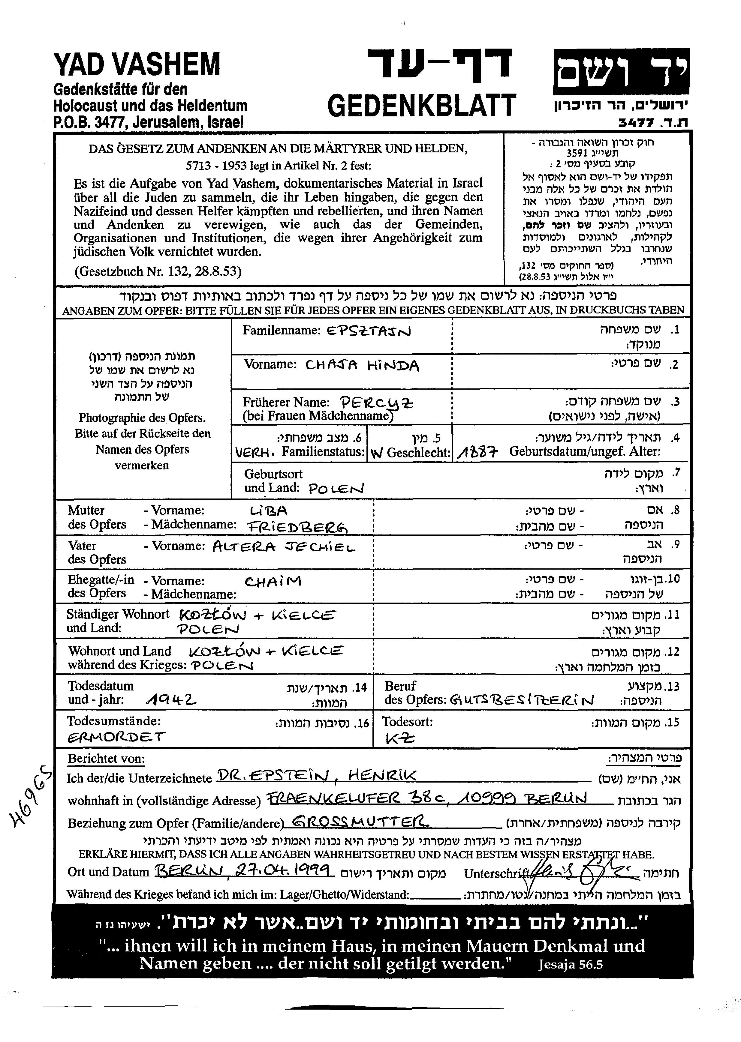 Epsztajn Chaja Hinda 1887 Kielce, Pologne Feuille de témoignage