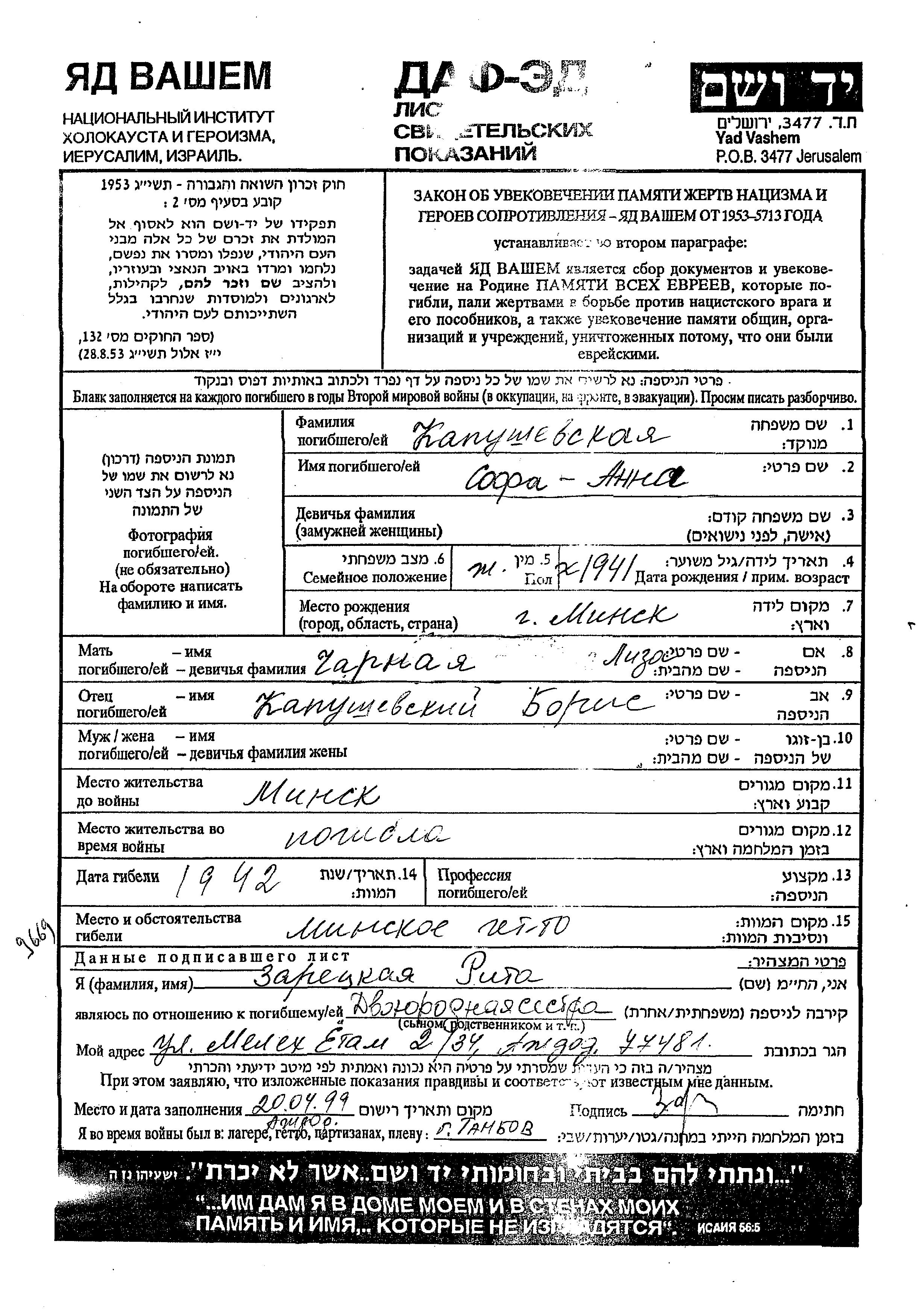 Kapushevski Sofa Anna 1941 Minsk, Bélorussie (URSS) Feuille de témoignage