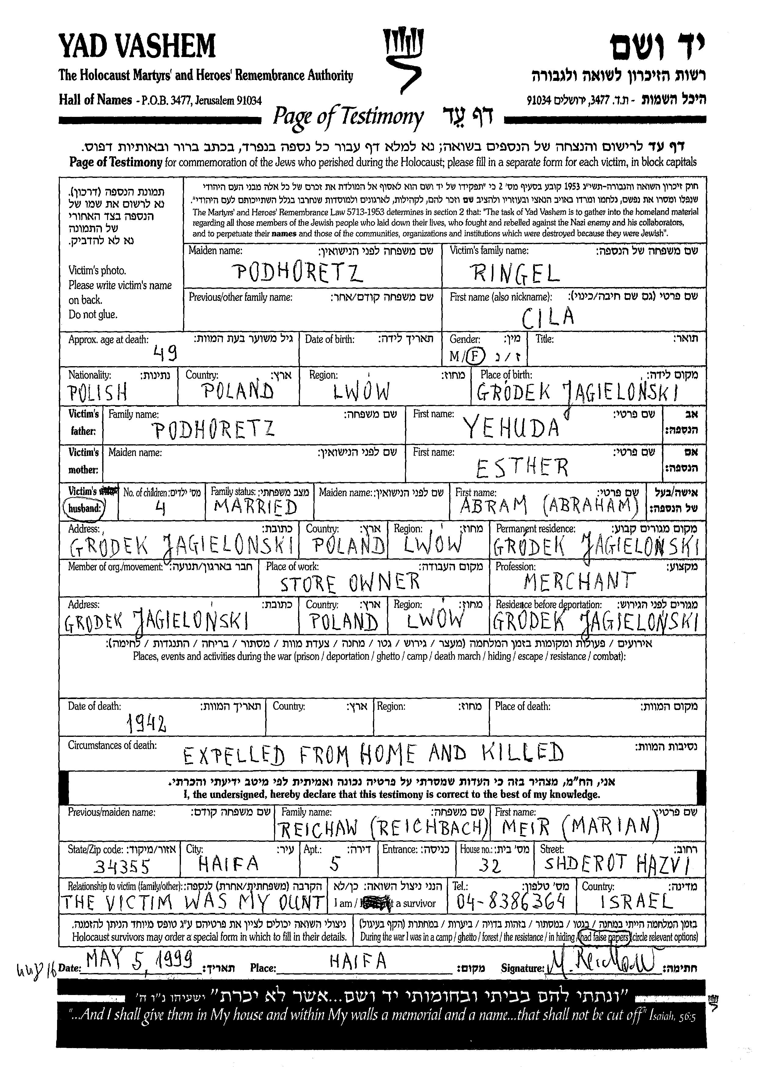 Cila רינגל לבית פודהורץ נולדה בGródek שבפולין ליהודה ואסתר. היא היתה סוחרת ונשואה לאברם. לפני מלחמת העולם השניה התגוררה בGródek שבפולין. בזמן המלחמה היא היתה בGródek שבפולין.