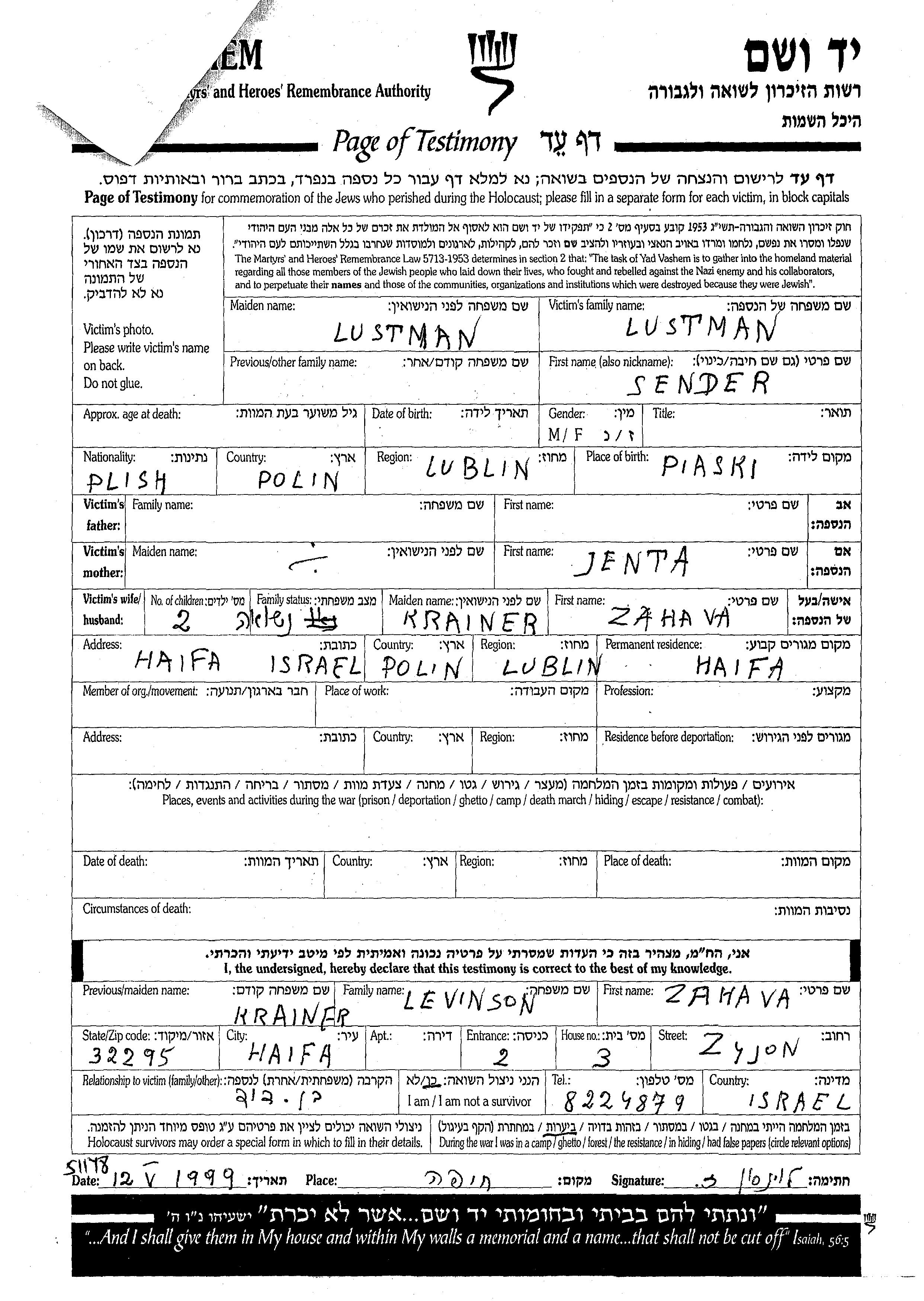 Sender לוסטמן נולד בPiaski שבפולין לJenta. הוא היה נשוי לזהבה לבית Krainer. לפני מלחמת העולם השניה התגורר בLublin שבפולין.