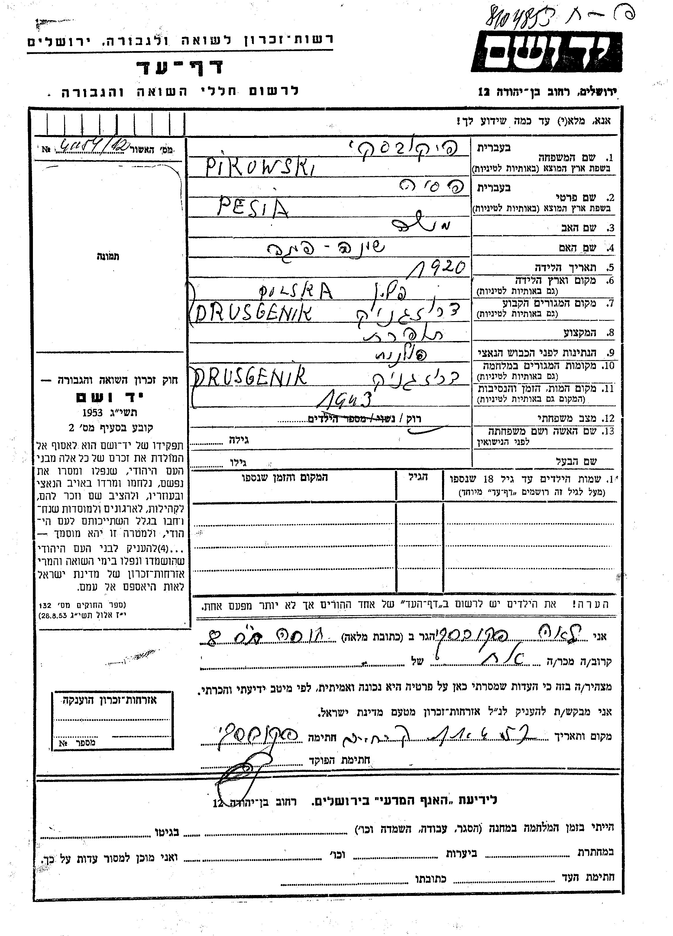 פסיה Pikowski נולדה בDruzgenik שבפולין בשנת 1920 למשה ושינה פייגה. היא היתה תופרת ורווקה. לפני מלחמת העולם השניה התגוררה בDruzgenik שבפולין. בזמן המלחמה היא היתה בDruzgenik שבפולין. פסיה נרצחה בשואה. מקום המוות: Druzgenik שבפולין בשנת 1943.