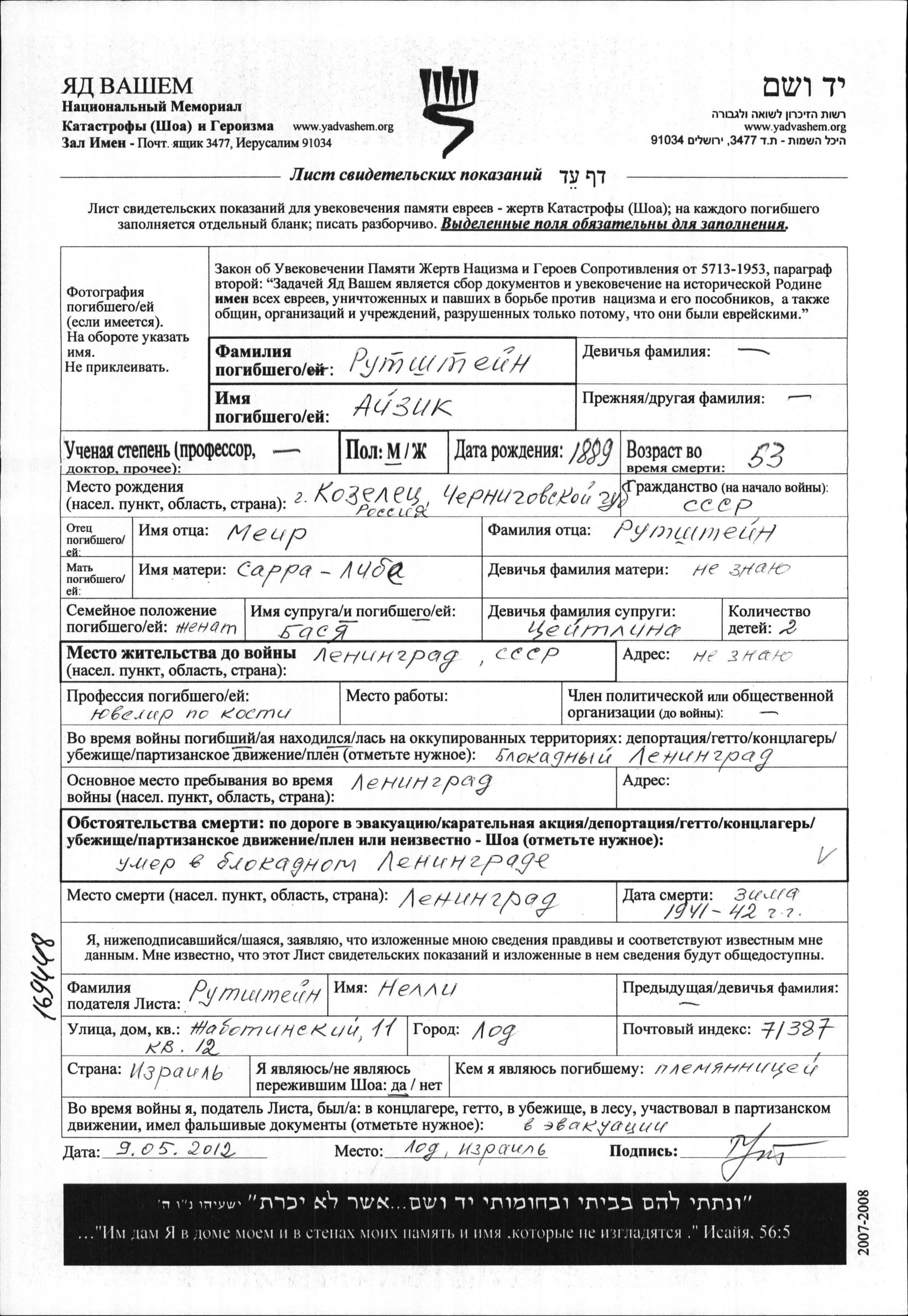 Ayzik Rutshteyn נולד בKozelets שבאוקראינה (ברה"מ) בשנת 1880 למאיר וSarra Libe. הוא היה תכשיטן ונשוי לBasya לבית Tzeytlina. לפני מלחמת העולם השניה התגורר בLeningrad שברוסיה (ברה"מ). בזמן המלחמה הוא היה בLeningrad שברוסיה (ברה"מ). הוא נספה/תה בתקופה 1933-1945 בקשר עקיף לשואה. מקום המוות: Leningrad שברוסיה (ברה"מ) בשנת 1941.