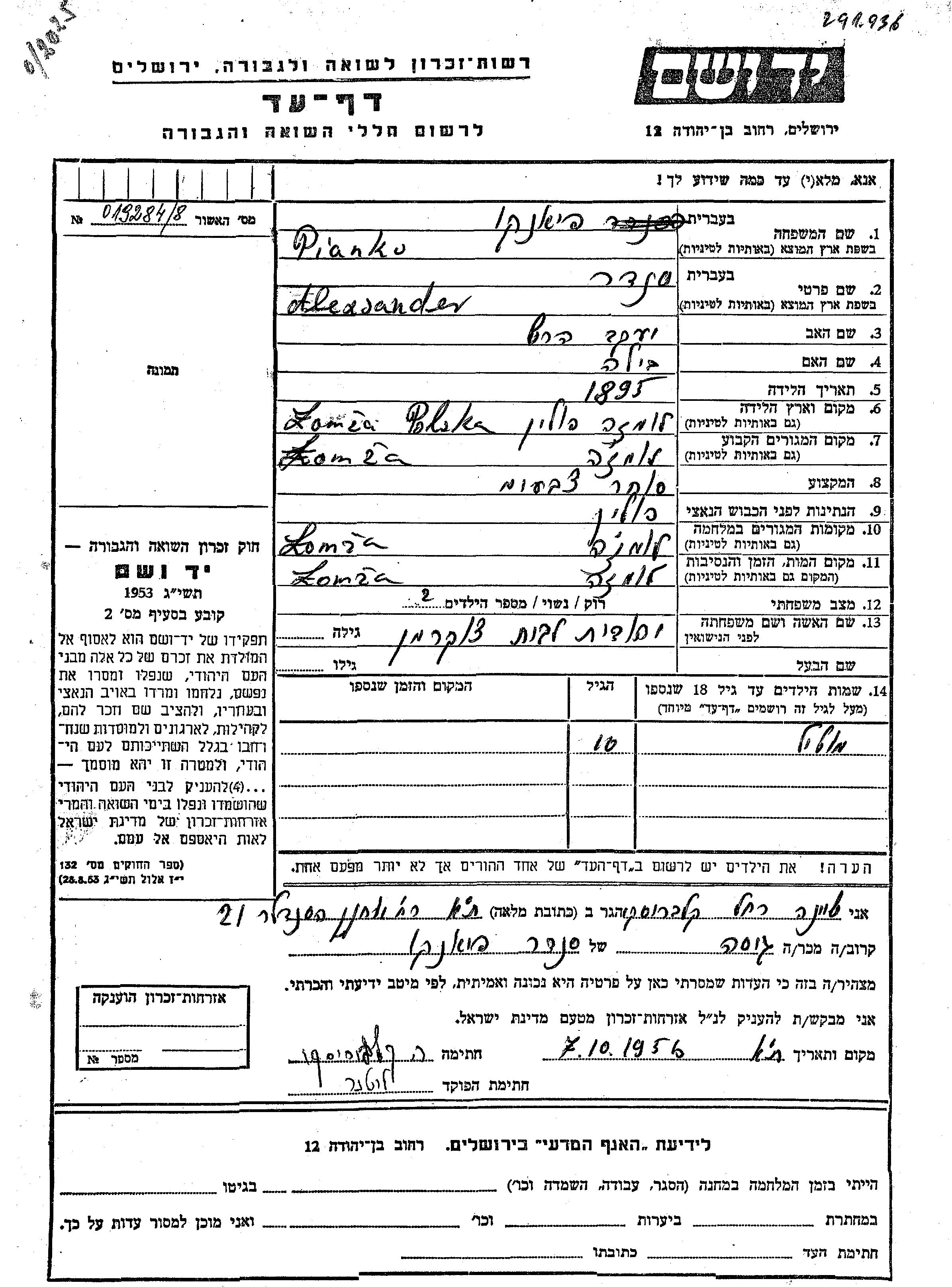 Alexsander פיאנקו נולד בŁomża שבפולין בשנת 1895 ליעקב הרש ובילה. הוא היה סוחר צבעים ונשוי ליהודית לבית צוקרמן. לפני מלחמת העולם השניה התגורר בŁomża שבפולין. בזמן המלחמה הוא היה בŁomża שבפולין.