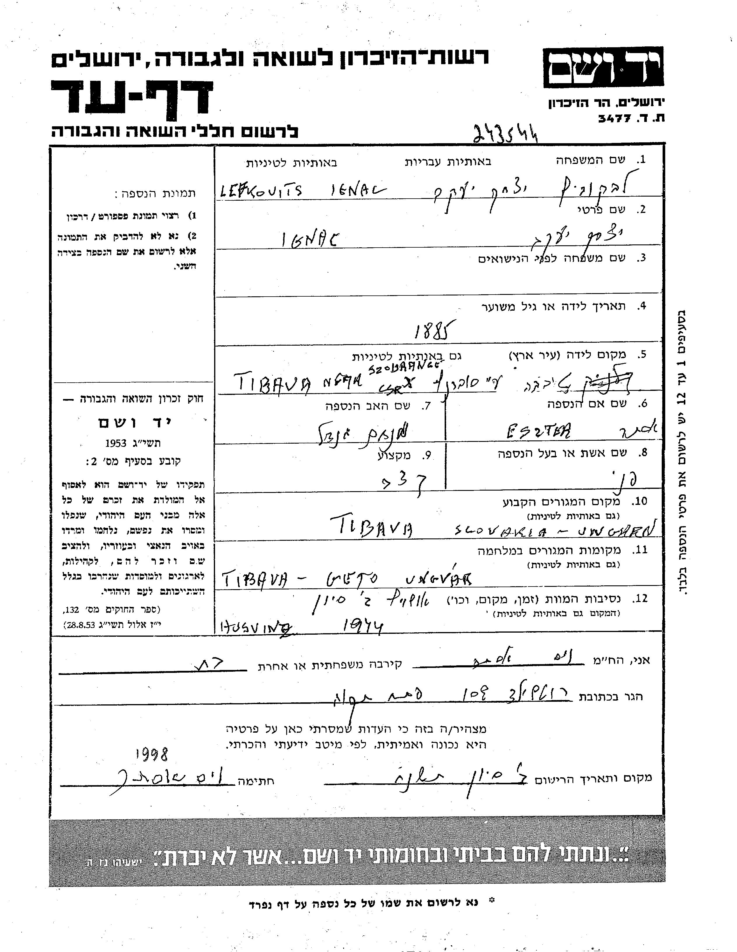 Ignac יצחק יעקב Levkovits נולד בTibava שבצ'כוסלובקיה בשנת 1885 למנחם מנדל ואסתר. הוא היה קצב ונשוי לפני. לפני מלחמת העולם השניה התגורר בTibava שבצ'כוסלובקיה. בזמן המלחמה הוא היה בTibava שבצ'כוסלובקיה. הוא נרצח בשואה. מקום המוות: Auschwitz שבפולין בשנת 1944.