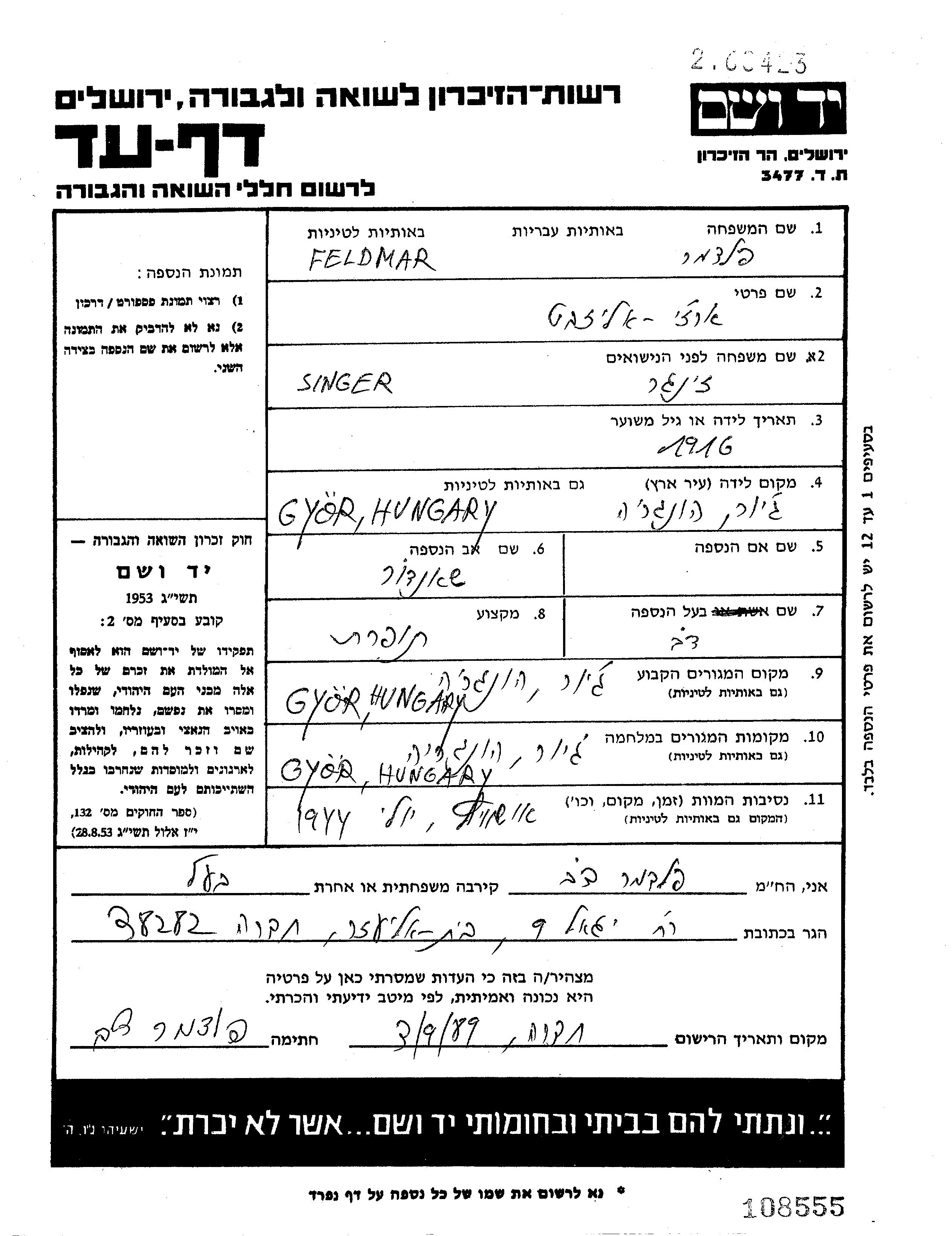 אליזבט פלדמר לבית זינגר נולדה בGyor שבהונגריה בשנת 1916 לשאנדור. היא היתה תופרת ונשואה לדב. לפני מלחמת העולם השניה התגוררה בGyor שבהונגריה. בזמן המלחמה היא היתה בGyor שבהונגריה.