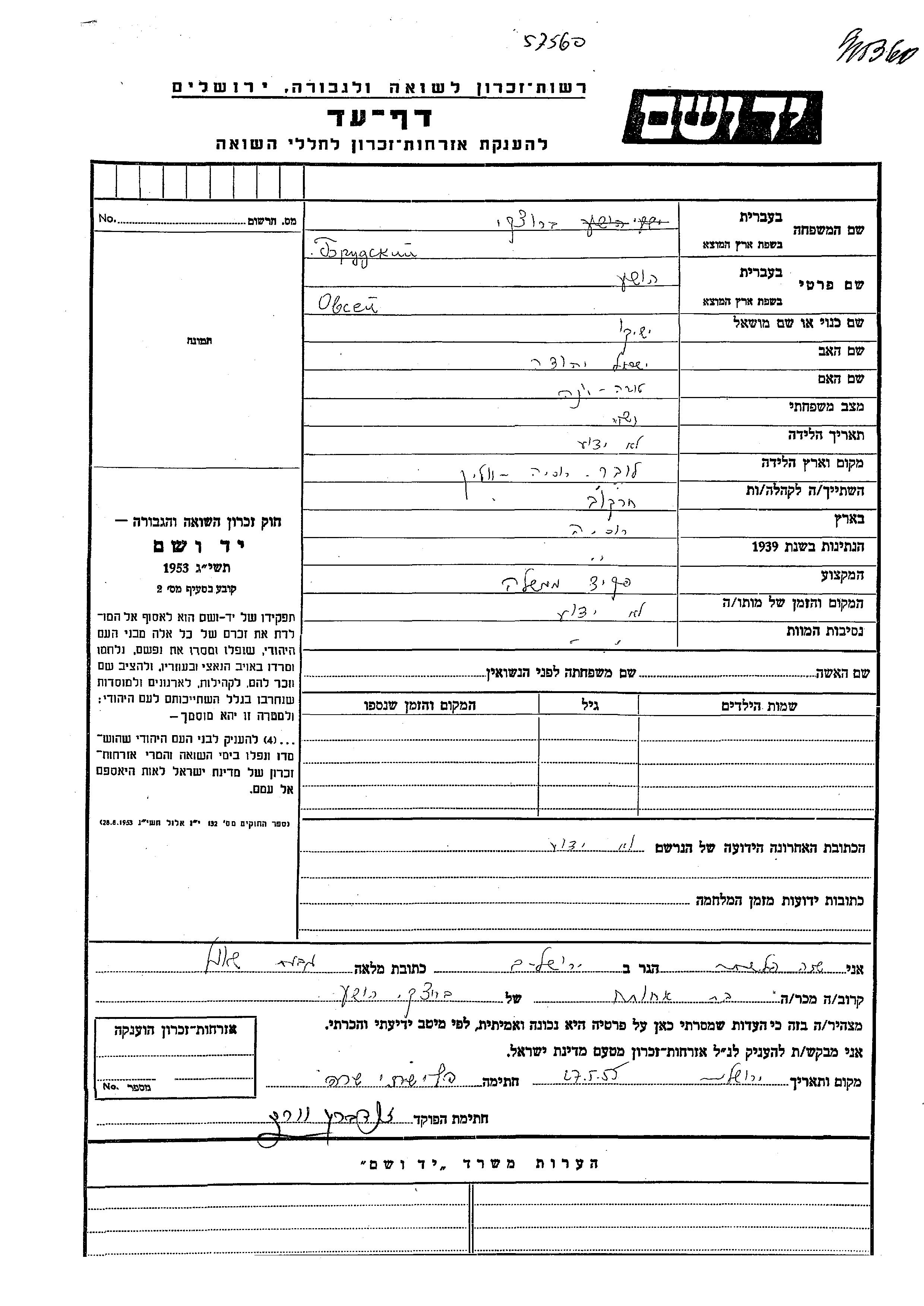 אובסיי הושע Brudski נולד בLuber שבאוקראינה (ברה"מ) לישראל יהודה וטובה אנה. הוא היה פקיד ונשוי.