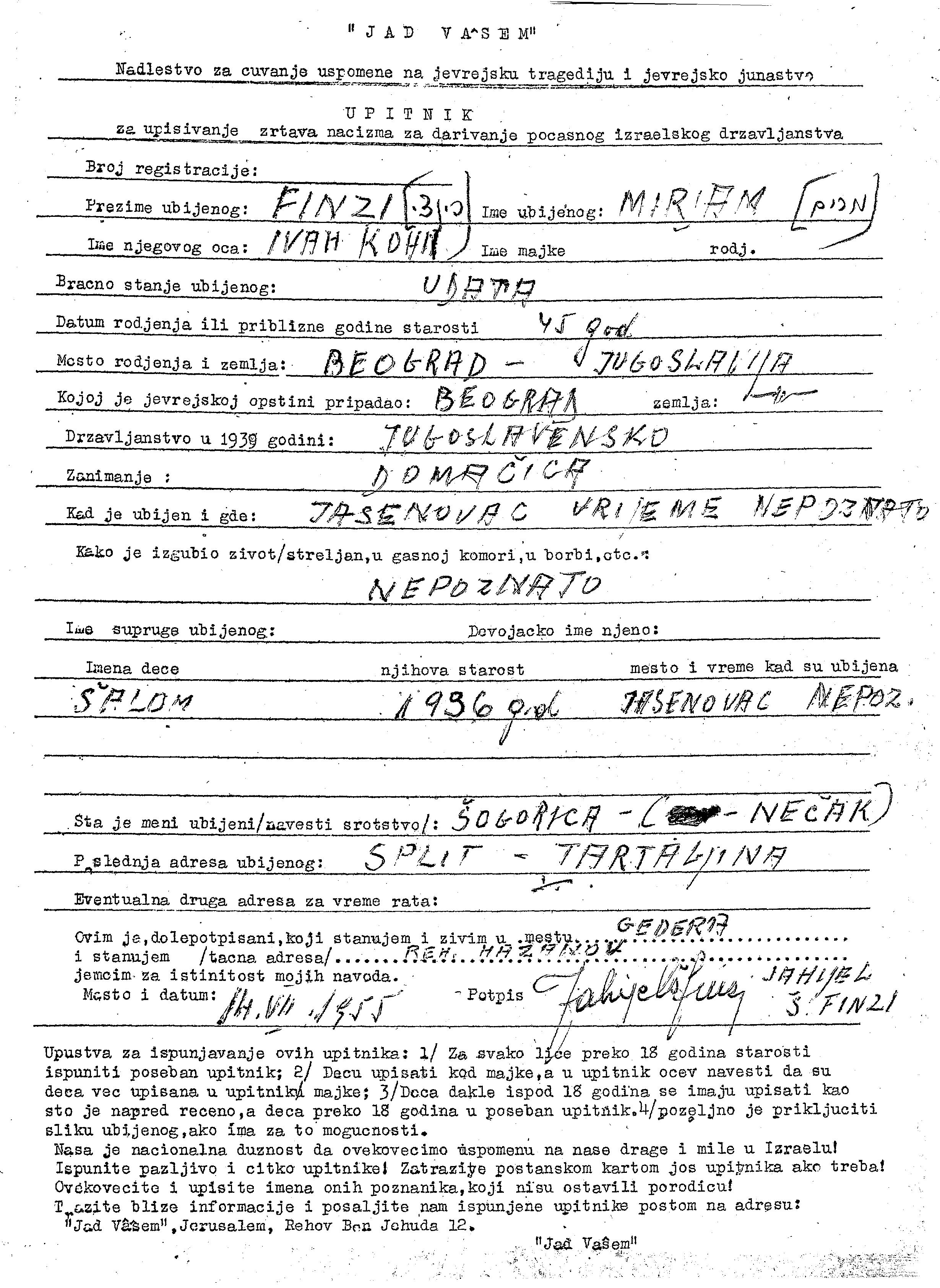 מרים נרצחה בשואה. מקום המוות: Jasenovac שביוגוסלביה.