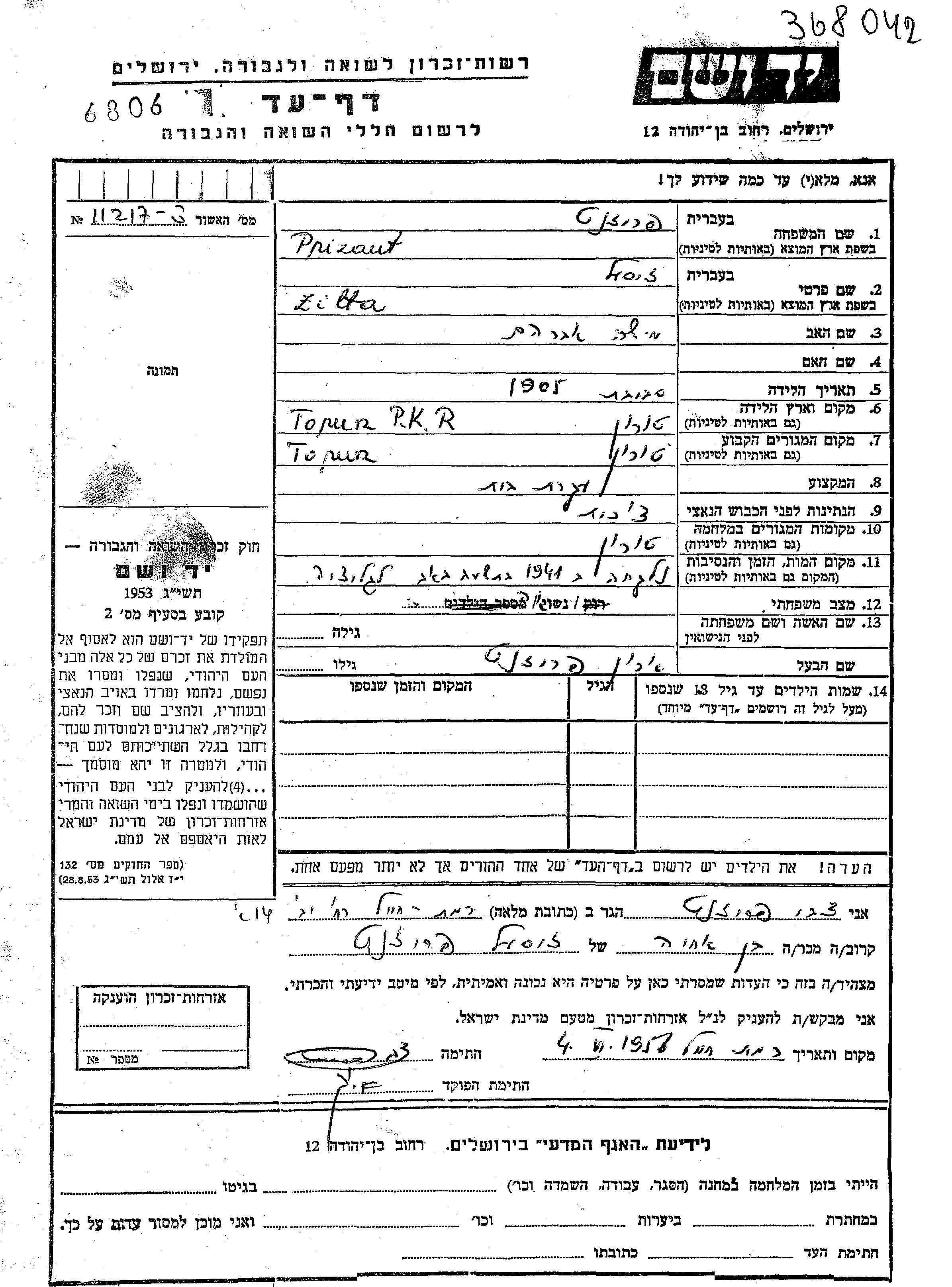 Zilta זיסעל פריזנט נולדה בTorun שבצ'כוסלובקיה בשנת 1905 למשה אברהם. היא היתה עקרת בית ונשואה לארון. לפני מלחמת העולם השניה התגוררה בTorun שבצ'כוסלובקיה. בזמן המלחמה היא היתה בTorun שבצ'כוסלובקיה. היא נרצחה בשואה. מקום המוות: Galicia Region שבפולין בשנת 1941.