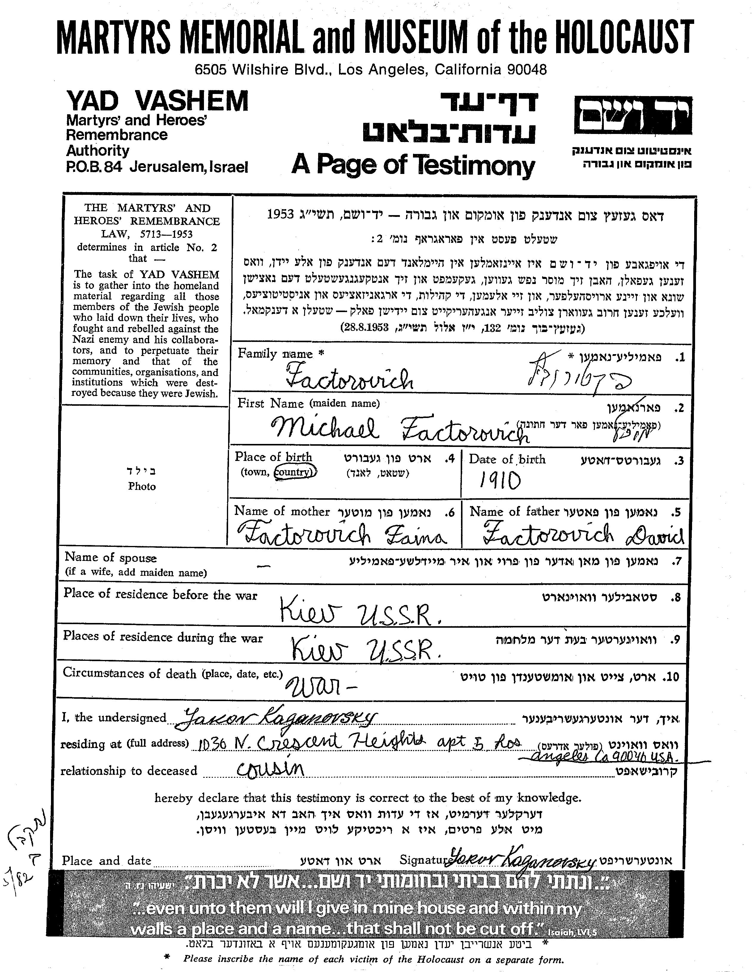 מיכאל Factorovich נולד בשנת 1910 לדוד ופיינה. לפני מלחמת העולם השניה התגורר בKiew שבאוקראינה (ברה"מ). בזמן המלחמה הוא היה בKiew שבאוקראינה (ברה"מ). מיכאל נרצח בשואה.