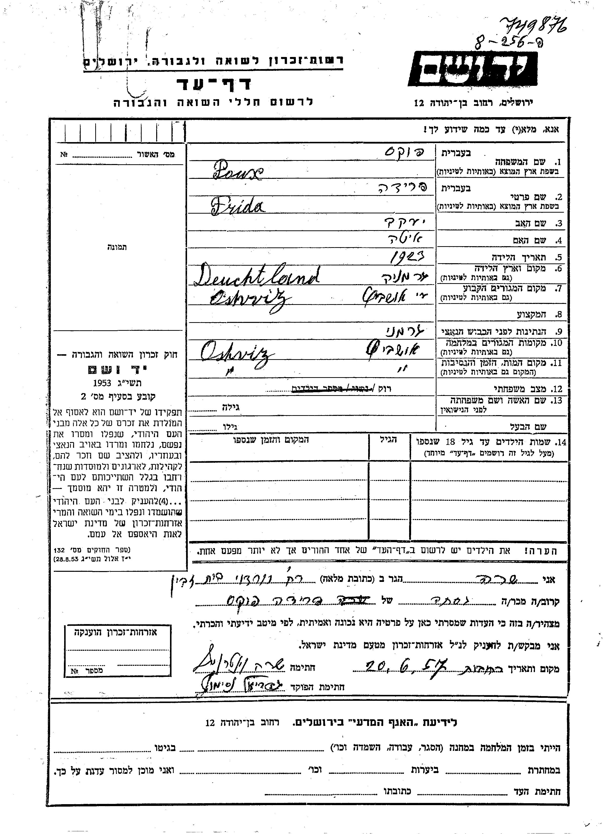 פרידה Foux נולדה בגרמניה בשנת 1923 ליעקב ואיטה. היא היתה רווקה. לפני מלחמת העולם השניה התגוררה בAuschwitz שבפולין. בזמן המלחמה היא היתה בAuschwitz שבפולין. פרידה נרצחה בשואה. מקום המוות: Auschwitz שבפולין.