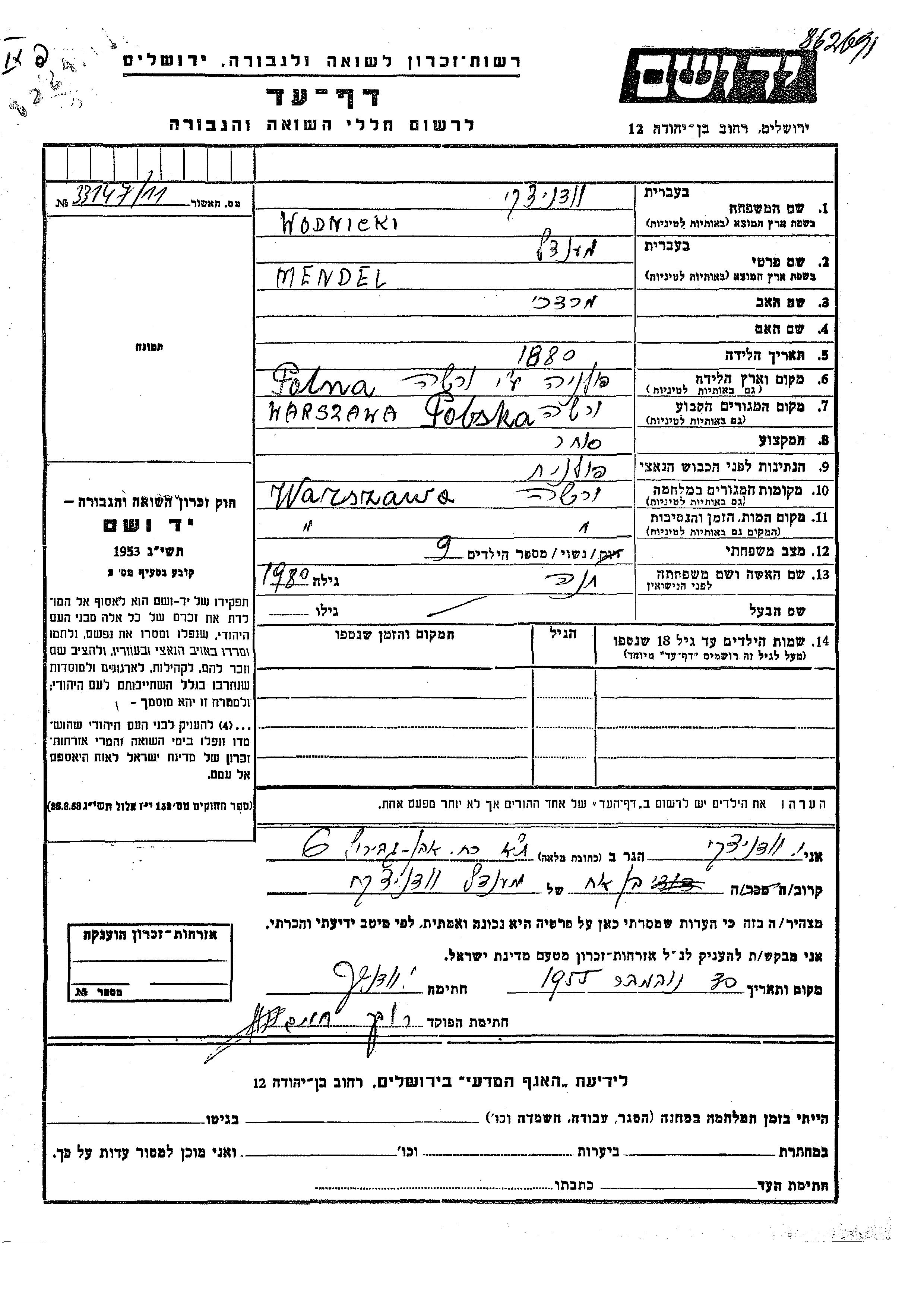 מנדל Wodnicki נולד בWarsaw שבפולין בשנת 1880 למרדכי. הוא היה סוחר ונשוי לחנה. לפני מלחמת העולם השניה התגורר בWarszawa שבפולין. בזמן המלחמה הוא היה בWarszawa שבפולין. מנדל נרצח בשואה. מקום המוות: Warszawa שבפולין.