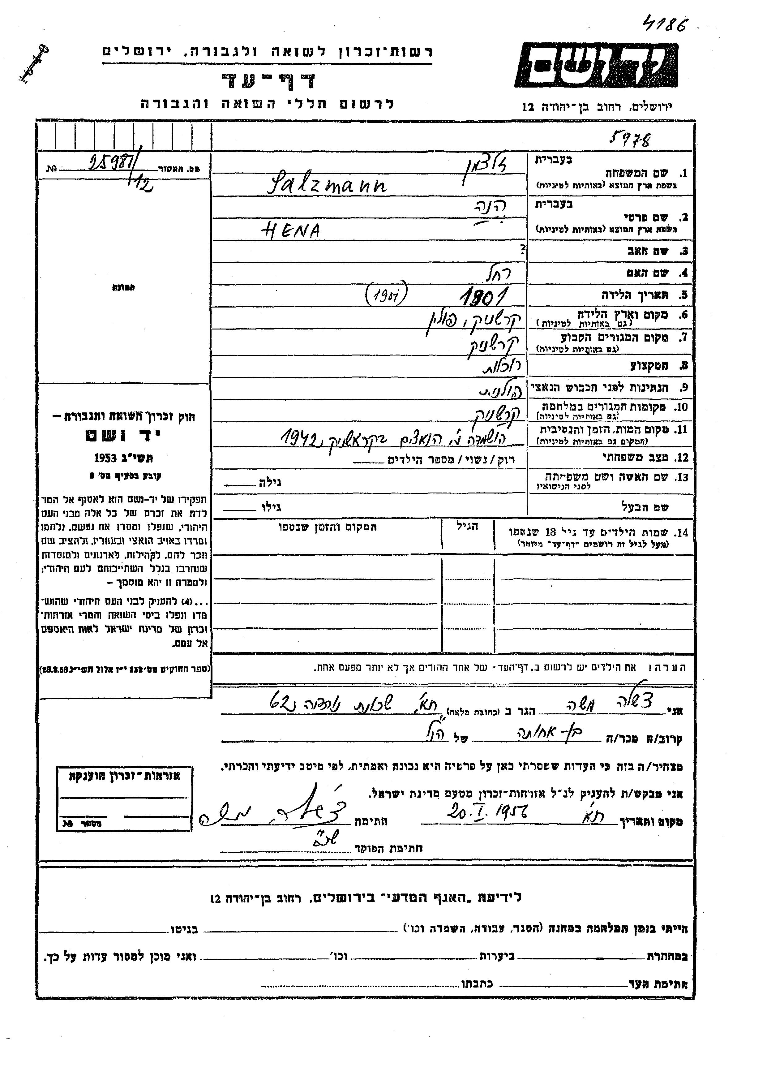 הנה Salzmann נולדה בKrashnik שבפולין בשנת 1901 לרחל. היא היתה רוכלת. לפני מלחמת העולם השניה התגוררה בKrashnik שבפולין. בזמן המלחמה היא היתה בKrashnik שבפולין. הנה נרצחה בשואה. מקום המוות: Krashnik שבפולין בשנת 1942.