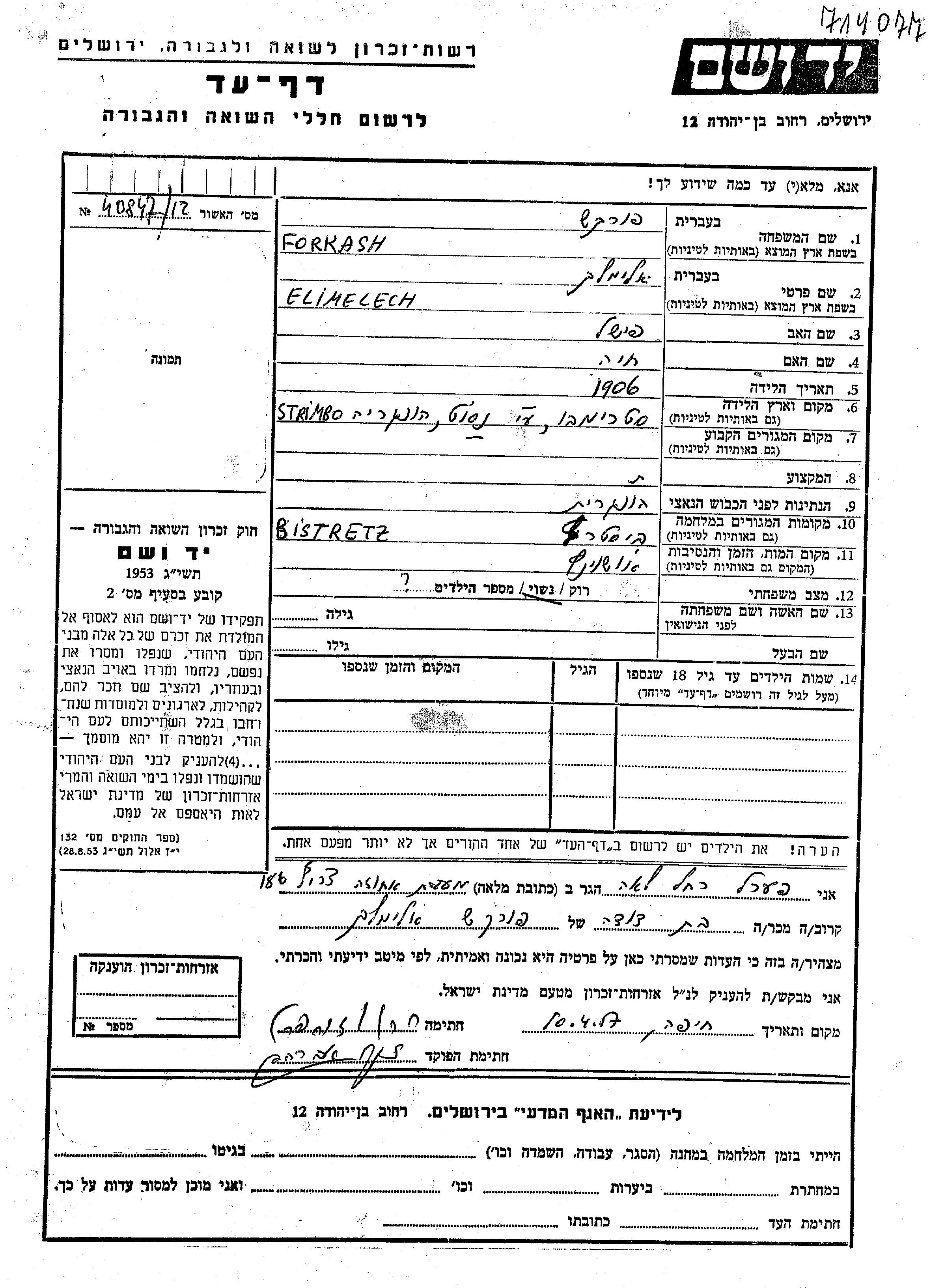Elimelech Forkash נולד בStrambu שברומניה בשנת 1906 לפישל וחיה. הוא היה נשוי. בזמן המלחמה הוא היה בBistrita שברומניה. הוא נרצח בשואה. מקום המוות: Auschwitz שבפולין.