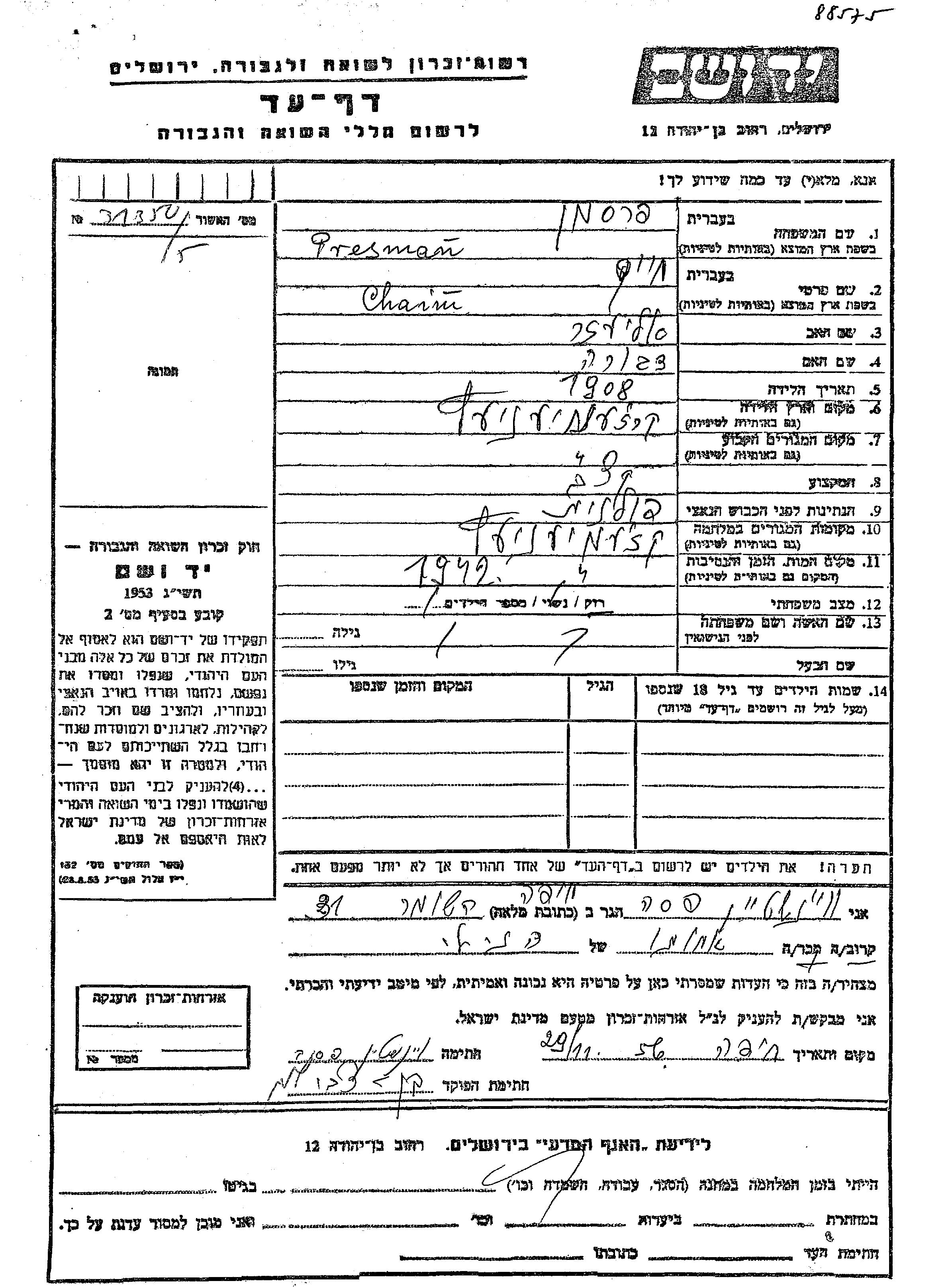 חיים פרסמן נולד בKrzemieniec שבפולין בשנת 1908 לאליעזר ודבורה. הוא היה קצב ורווק. לפני מלחמת העולם השניה התגורר בKrzemieniec שבפולין. בזמן המלחמה הוא היה בKrzemieniec שבפולין. חיים נרצח בשואה. מקום המוות: Krzemieniec שבפולין בשנת 1942.