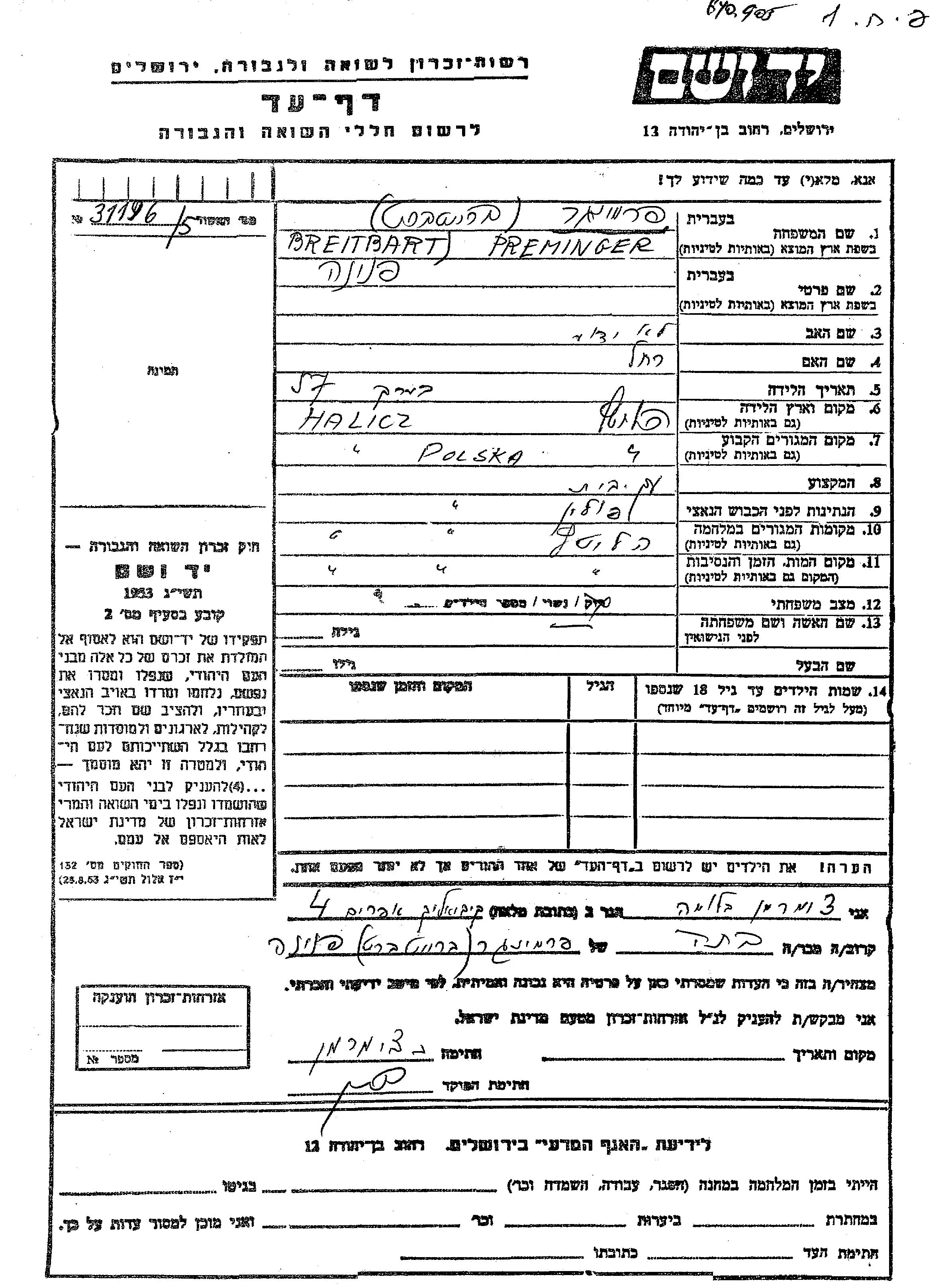 פנינה נרצחה בשואה. מקום המוות: Halicz שבפולין.