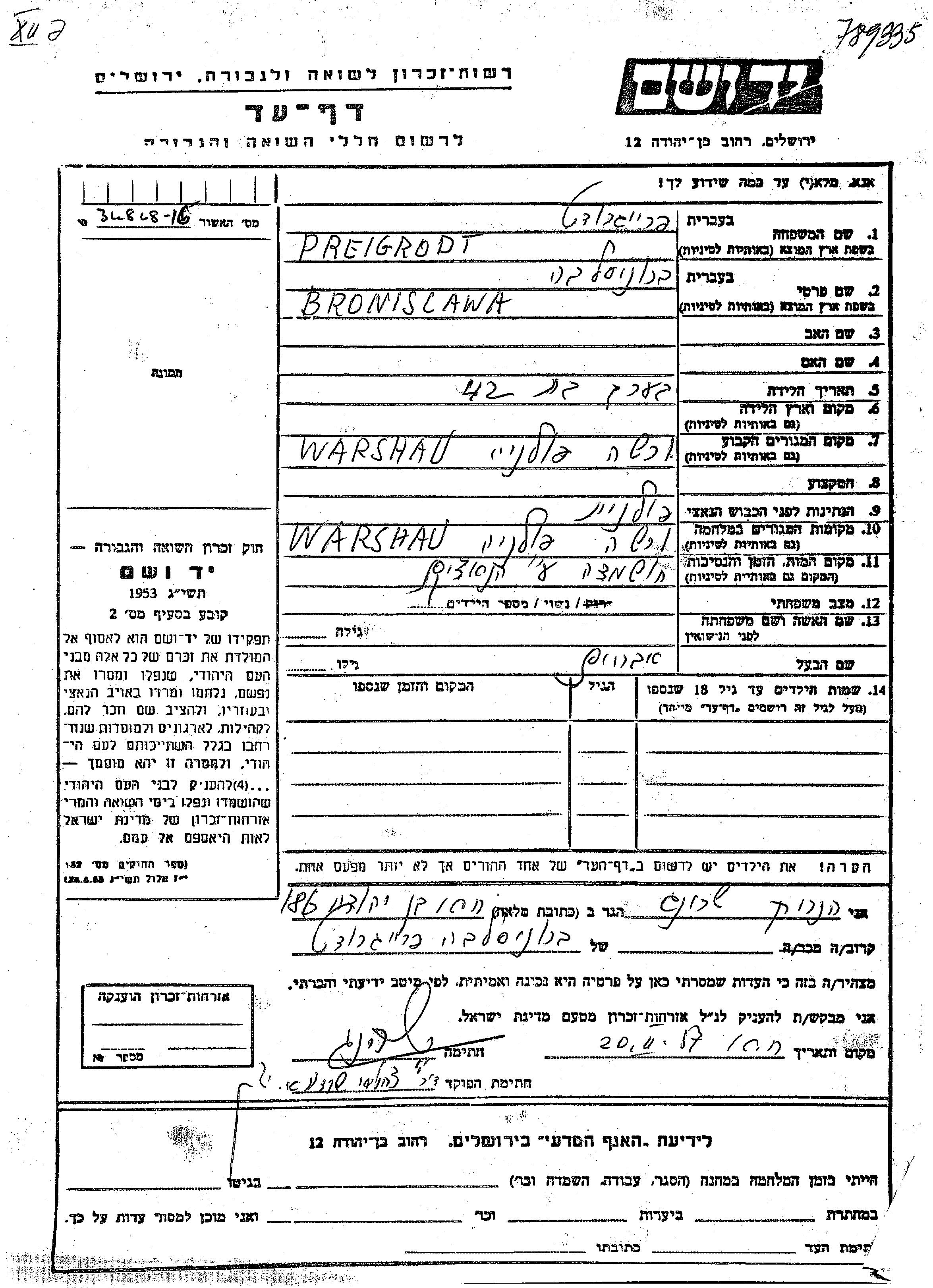 Bronislawa Preigrodt. היא היתה נשואה לאבריים. לפני מלחמת העולם השניה התגוררה בVarsha שבפולין. בזמן המלחמה היא היתה בVarsha שבפולין.