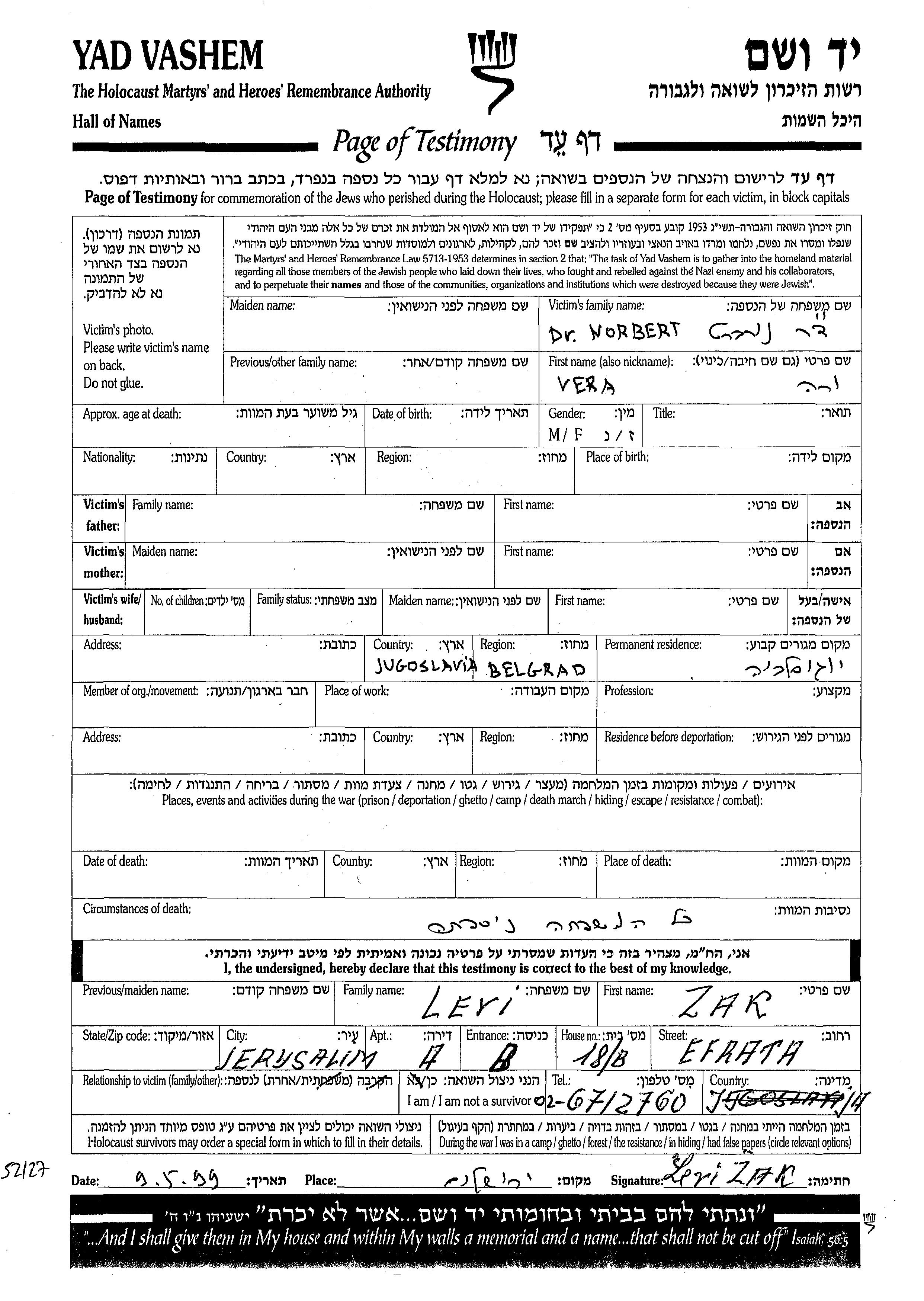 דר. ורה נורברט. לפני מלחמת העולם השניה התגוררה בBelgrad שביוגוסלביה.