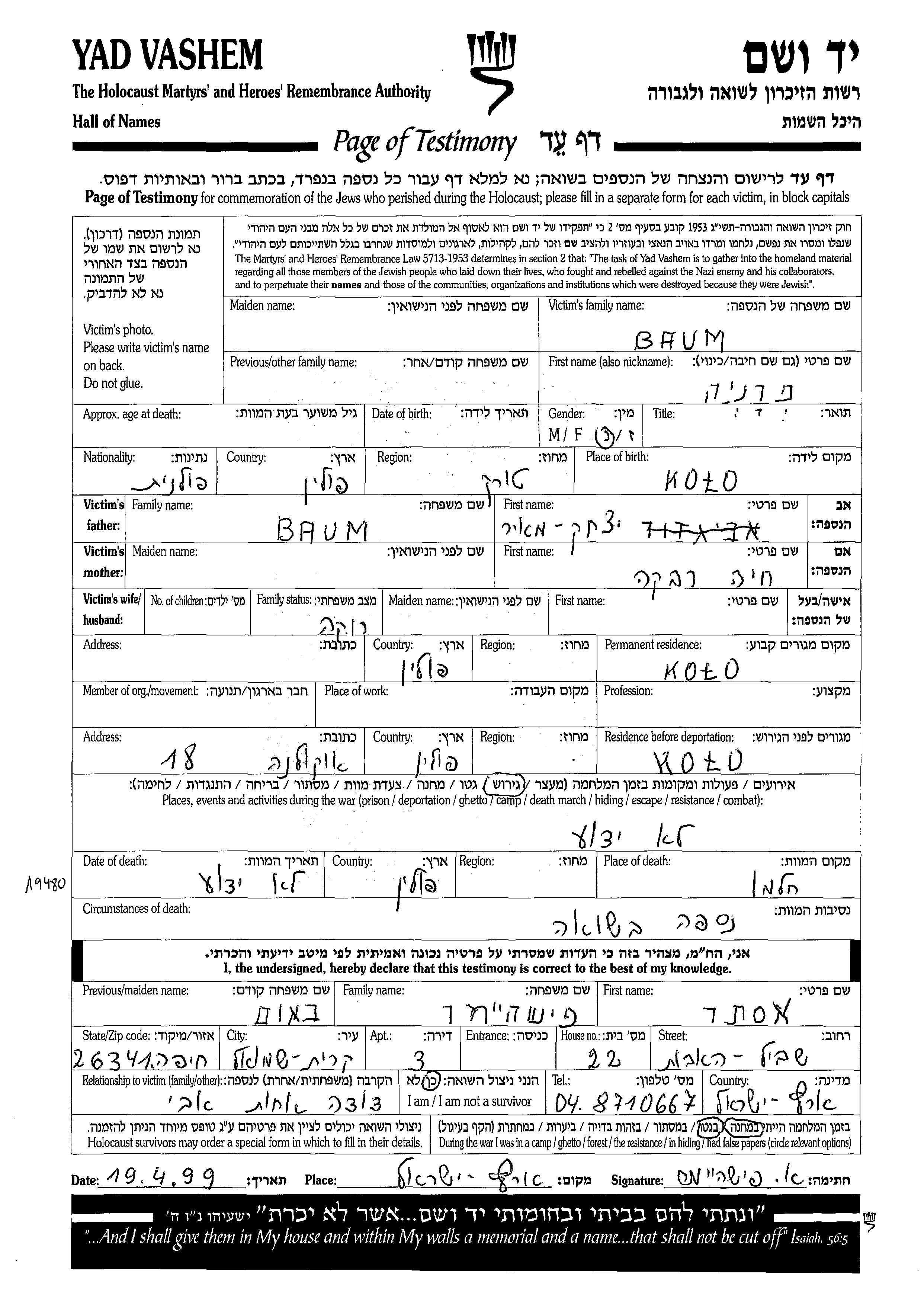 פרניה באום נולדה בKolo שבפולין ליצחק מאיר וחיה רבקה. היא היתה רווקה. לפני מלחמת העולם השניה התגוררה בKolo שבפולין. בזמן המלחמה היא היתה בKolo שבפולין.