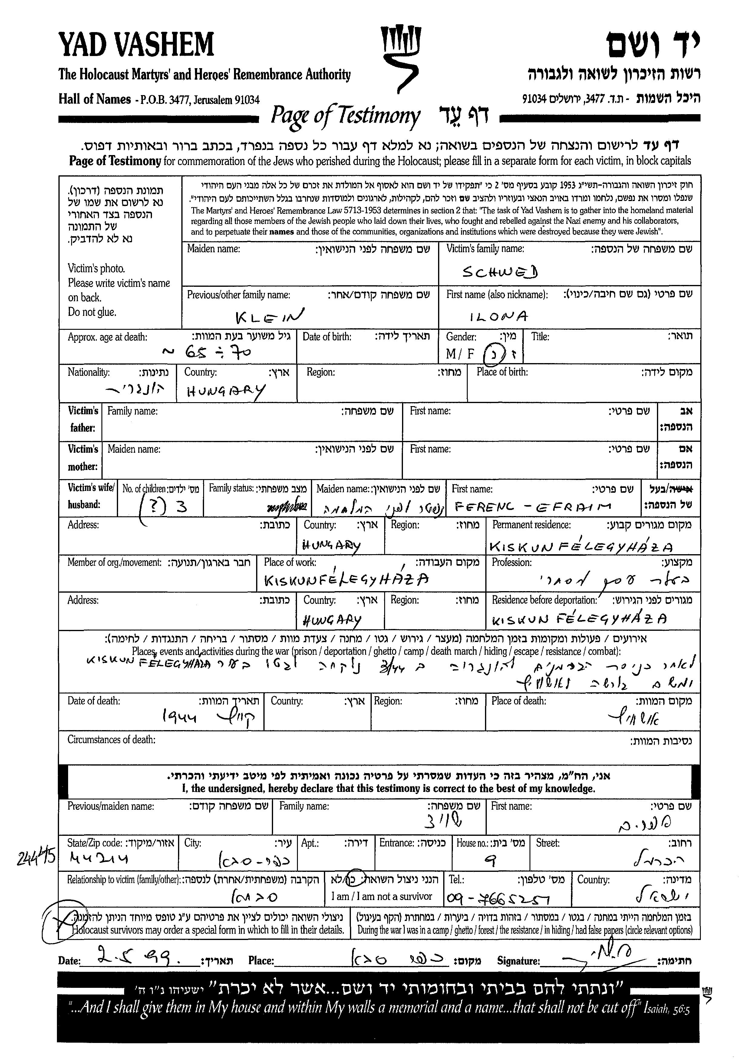 אילונה Schwed לבית קליין נולדה בהונגריה. היא היתה בעלת עסק ואלמנה לפרנץ אפרים. לפני מלחמת העולם השניה התגוררה בKiskunfelegyhaza שבהונגריה. בזמן המלחמה היא היתה בKiskunfelegyhaza שבהונגריה.