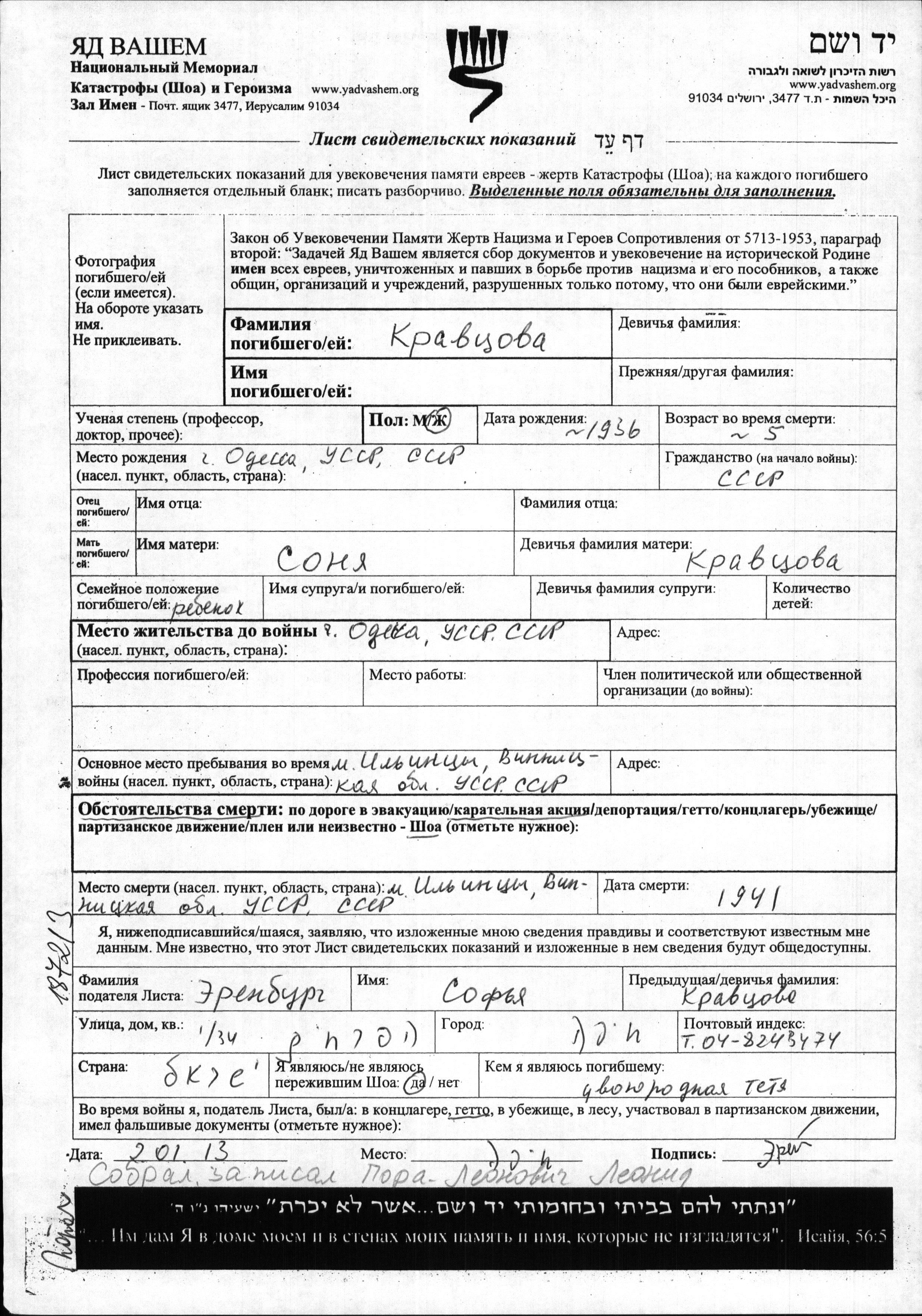 שם פרטי לא ידוע Kravtzova נולדה בOdessa שבאוקראינה (ברה"מ) בשנת 1936 לSonya. היא היתה ילדה. לפני מלחמת העולם השניה התגוררה בOdessa שבאוקראינה (ברה"מ). בזמן המלחמה היא היתה בIlyintsy שבאוקראינה (ברה"מ).