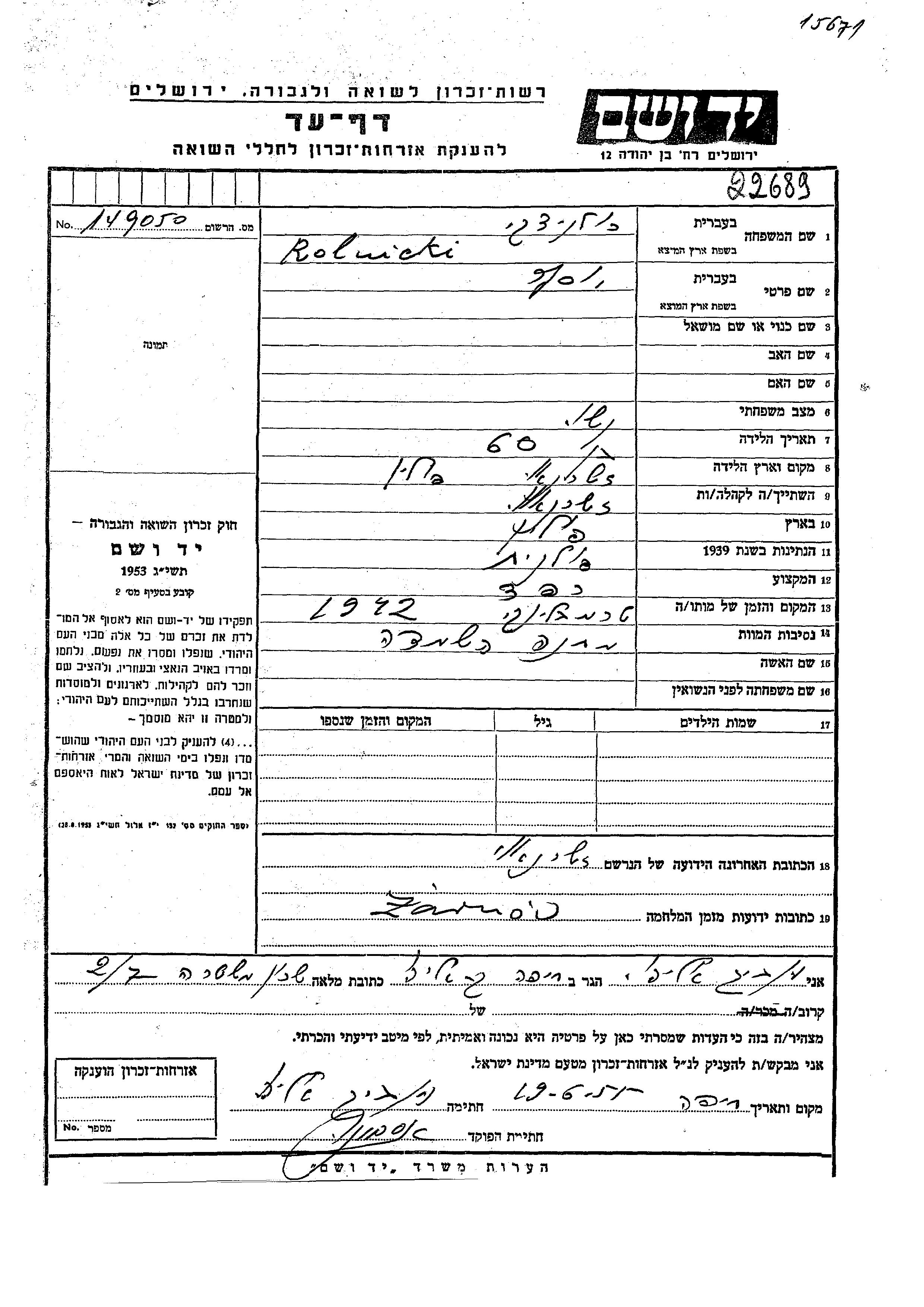 יוסף Rolnicki נולד בZarnow שבפולין. הוא היה רפד. לפני מלחמת העולם השניה התגורר בZarnow שבפולין. בזמן המלחמה הוא היה בZarnow שבפולין.