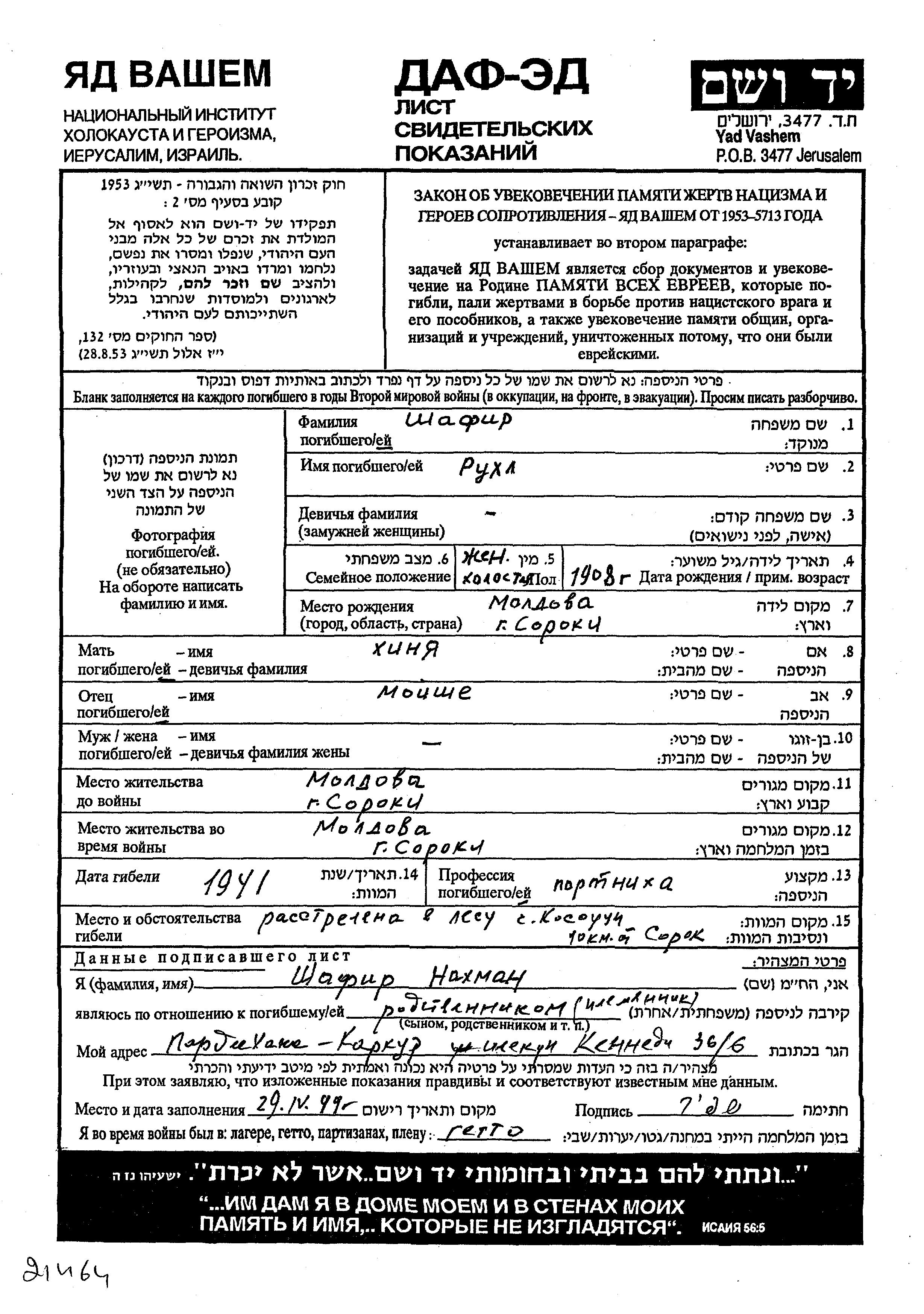 Rukhl שפיר נולדה בSoroki שברומניה בשנת 1908 לMoishe וKhinya. היא היתה תופרת. לפני מלחמת העולם השניה התגוררה בSoroki שברומניה. בזמן המלחמה היא היתה בSoroki שברומניה. היא נרצחה בשואה. מקום המוות: Soroki שברומניה בשנת 1941.