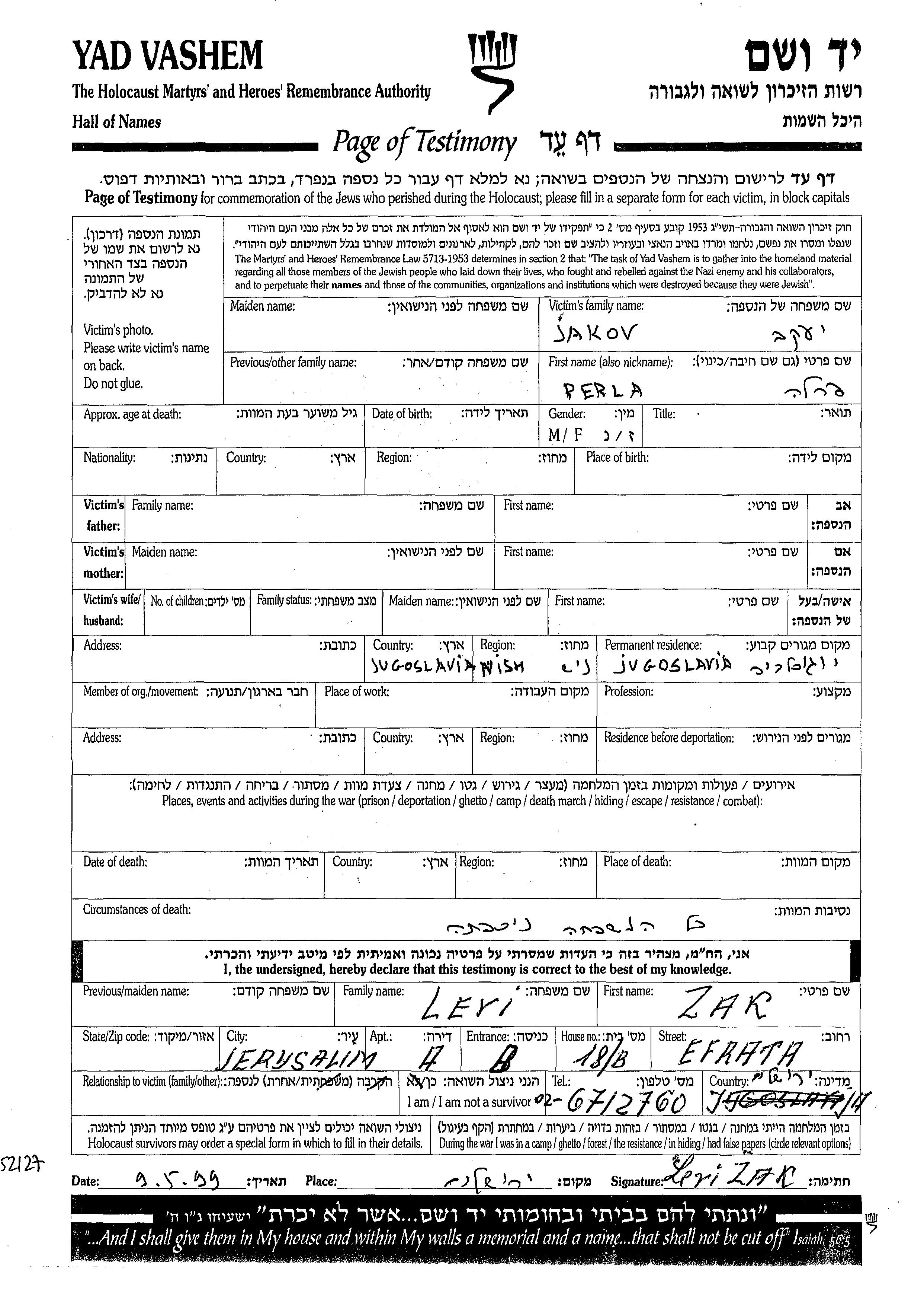 Perla Jakov. לפני מלחמת העולם השניה התגוררה בNish שביוגוסלביה.