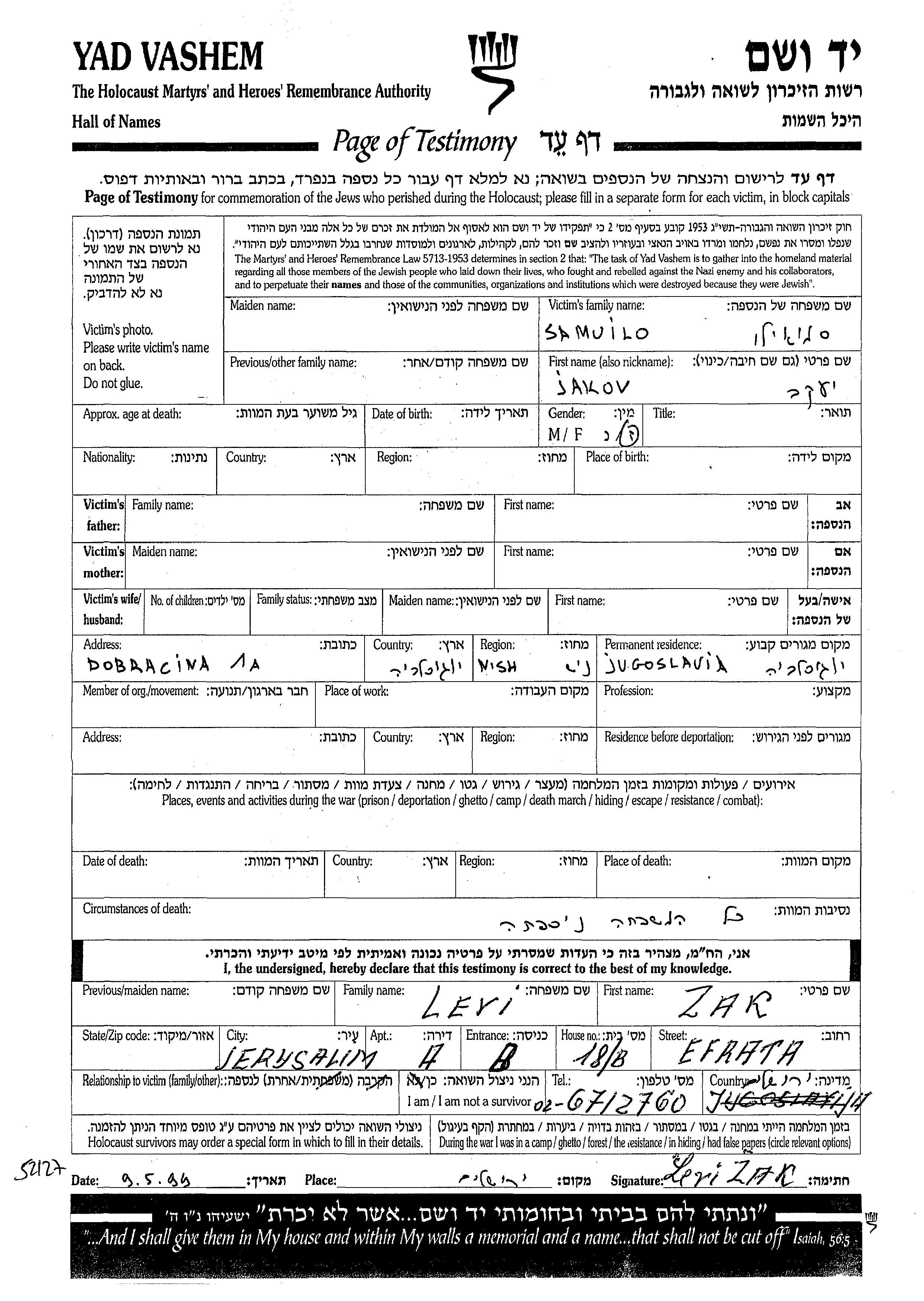 Jakov Samuilo. לפני מלחמת העולם השניה התגורר בNish שביוגוסלביה.