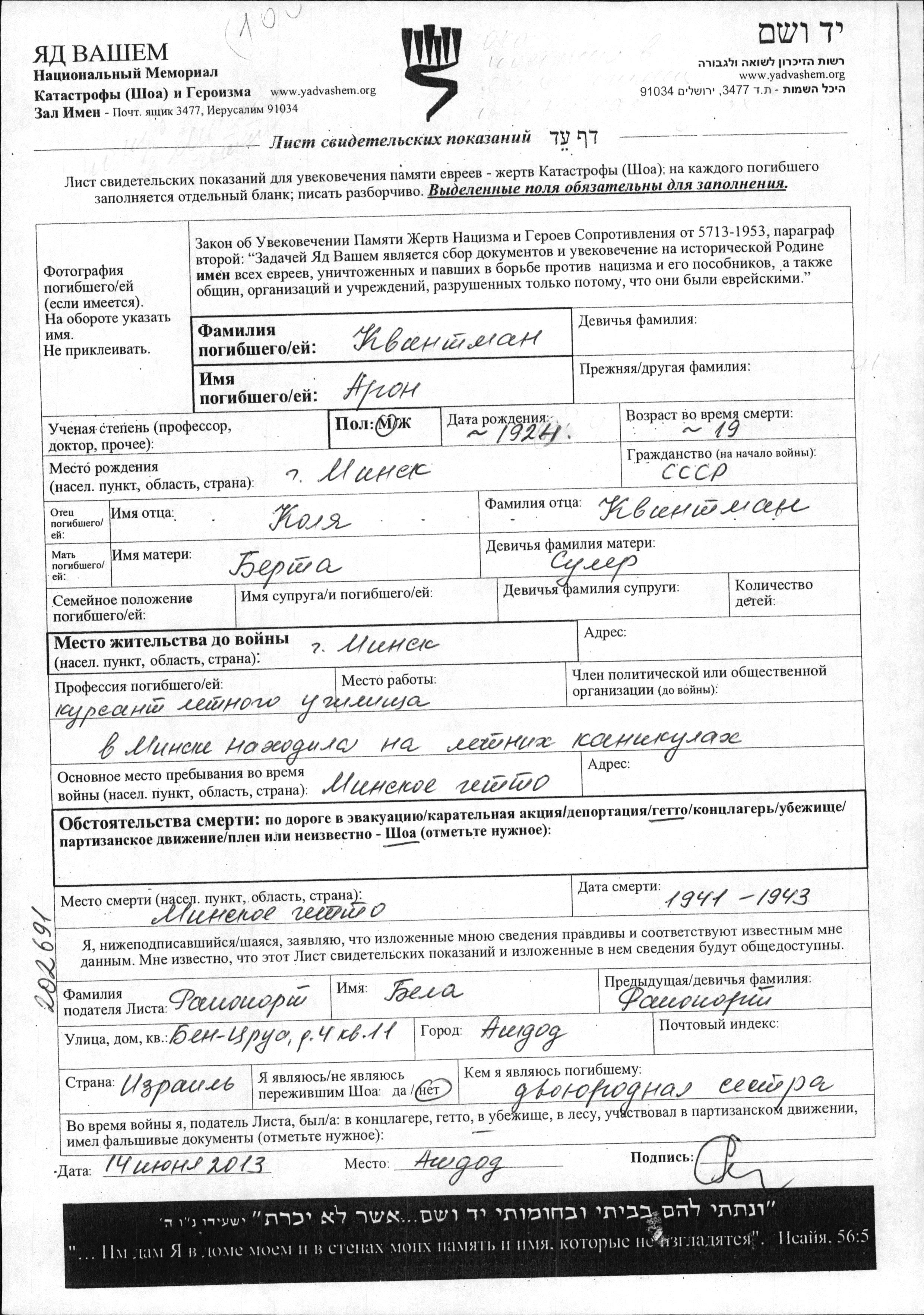 אראן קווינטמן נולד בMinsk שבביאלורוסיה (ברה"מ) בשנת 1924 לKolya וברטה לבית סולר. הוא היה Kursant lyotnogo uchilishcha russian. לפני מלחמת העולם השניה התגורר בMinsk שבביאלורוסיה (ברה"מ). בזמן המלחמה הוא היה בMinsk שבביאלורוסיה (ברה"מ). אראן נרצח בשואה. מקום המוות: Minsk שבביאלורוסיה (ברה"מ).
