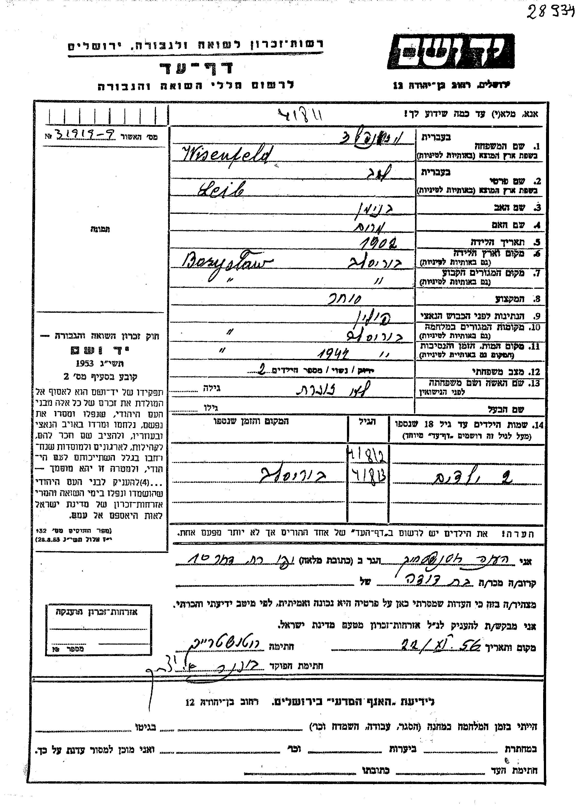 Wisenfeld לייב 1902 Boryslaw, פולין דף-עד