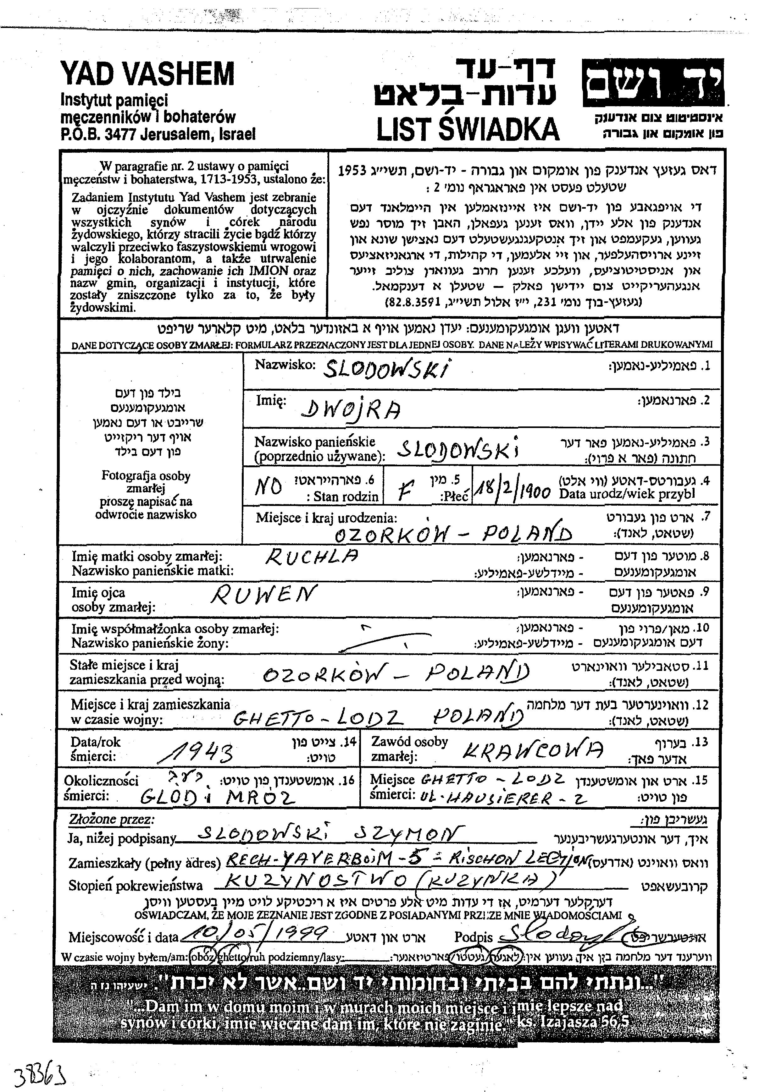Dwojra Slodowski נולדה בOzorkow שבפולין בשנת 1900 לRuwen וRuchla. היא היתה תופרת ורווקה. לפני מלחמת העולם השניה התגוררה בOzorkow שבפולין. בזמן המלחמה היא היתה בLodz שבפולין. היא נרצחה בשואה. מקום המוות: Lodz שבפולין בשנת 1943.
