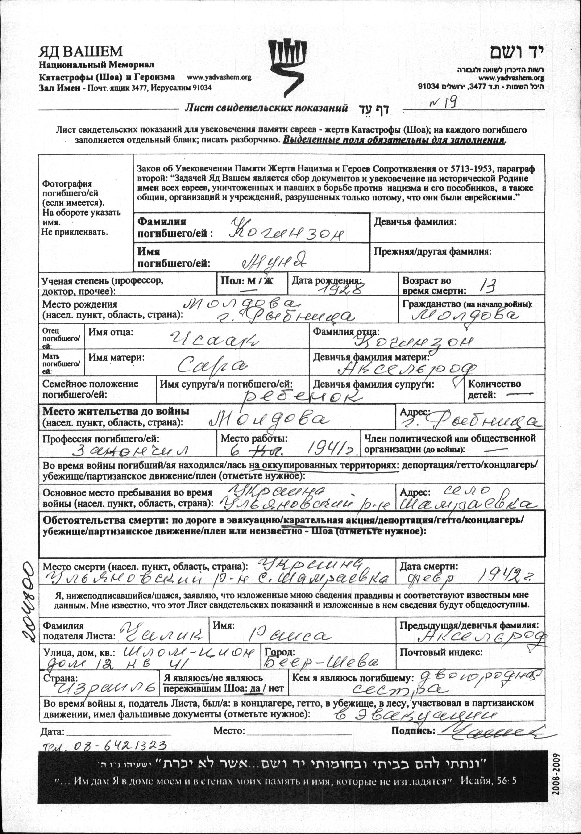 Munya Koganzon נולד בRybnitsa שבאוקראינה (ברה"מ) בשנת 1928 לIsaak ושרה לבית אקסלרוד. הוא היה תלמיד ונער. לפני מלחמת העולם השניה התגורר בRybnitsa שבאוקראינה (ברה"מ). בזמן המלחמה הוא היה בShamrayevka שבאוקראינה (ברה"מ). הוא נרצח בשואה. מקום המוות: Shamrayevka שבאוקראינה (ברה"מ) בשנת 02/1942.