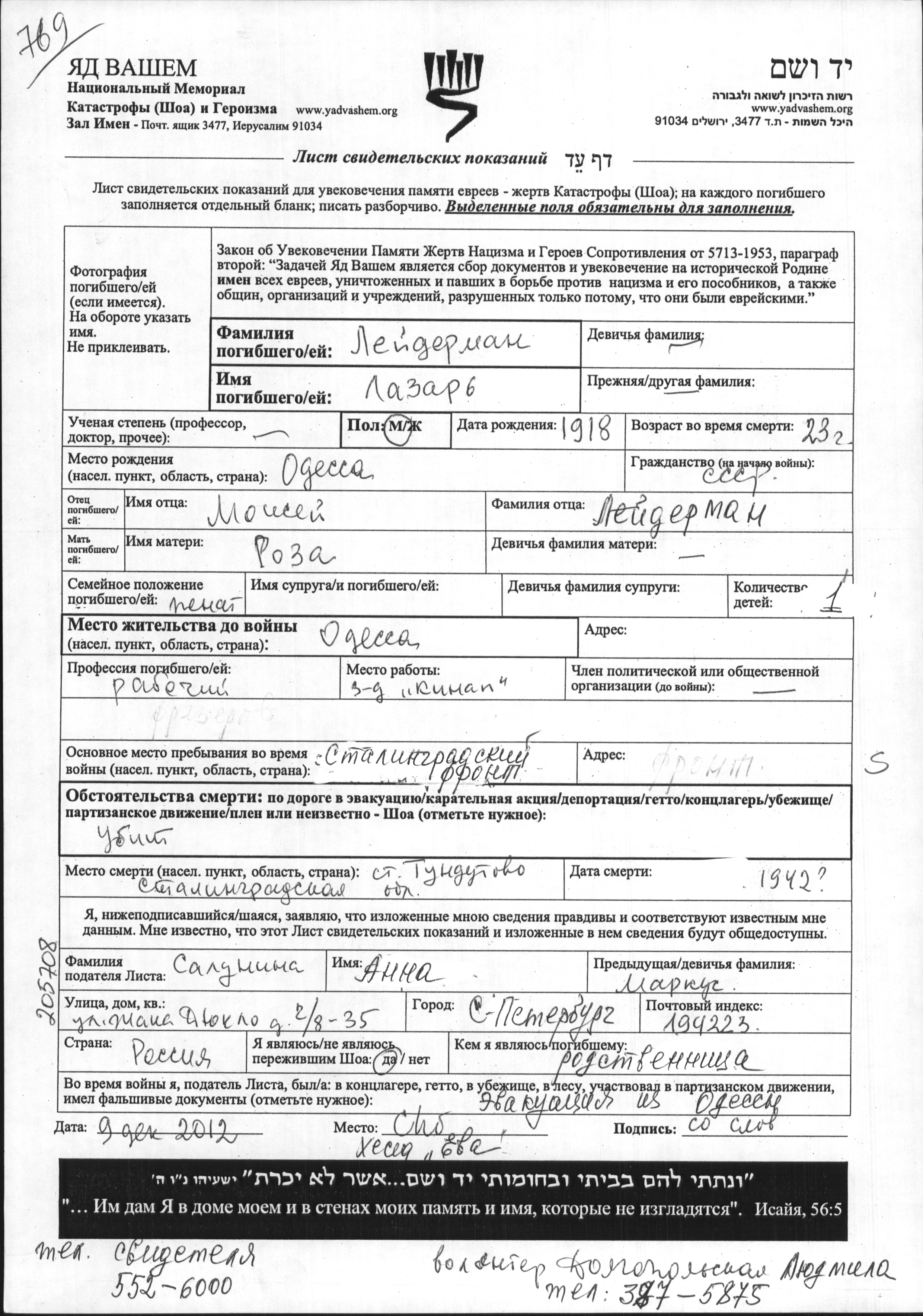 Lazar Leyderman נולד בOdessa שבאוקראינה (ברה"מ) בשנת 1918 לMoisey וRoza. הוא היה פועל בבית חרושת ונשוי. לפני מלחמת העולם השניה התגורר בOdessa שבאוקראינה (ברה"מ). בזמן המלחמה הוא היה בצבא הסובייטי. הוא נהרג בשירות צבאי. מקום המוות: Tundutovo שברוסיה (ברה"מ) בשנת 1942.