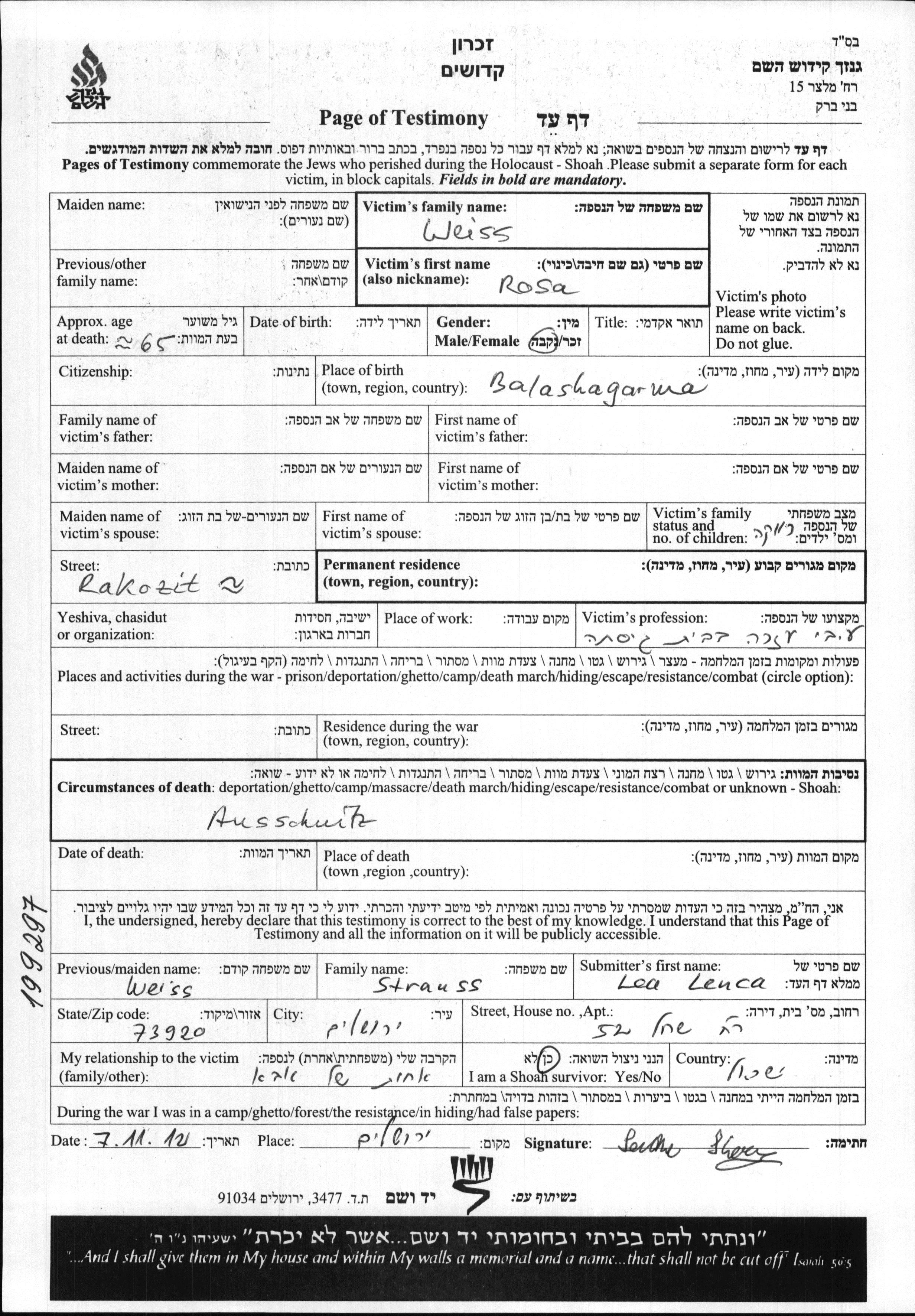 רוסה Weiss נולדה בBalasagyar שבהונגריה. היא היתה עקרת בית ורווקה. לפני מלחמת העולם השניה התגוררה בBalasagyar שבהונגריה. רוסה נרצחה בשואה. מקום המוות: Auschwitz שבפולין.