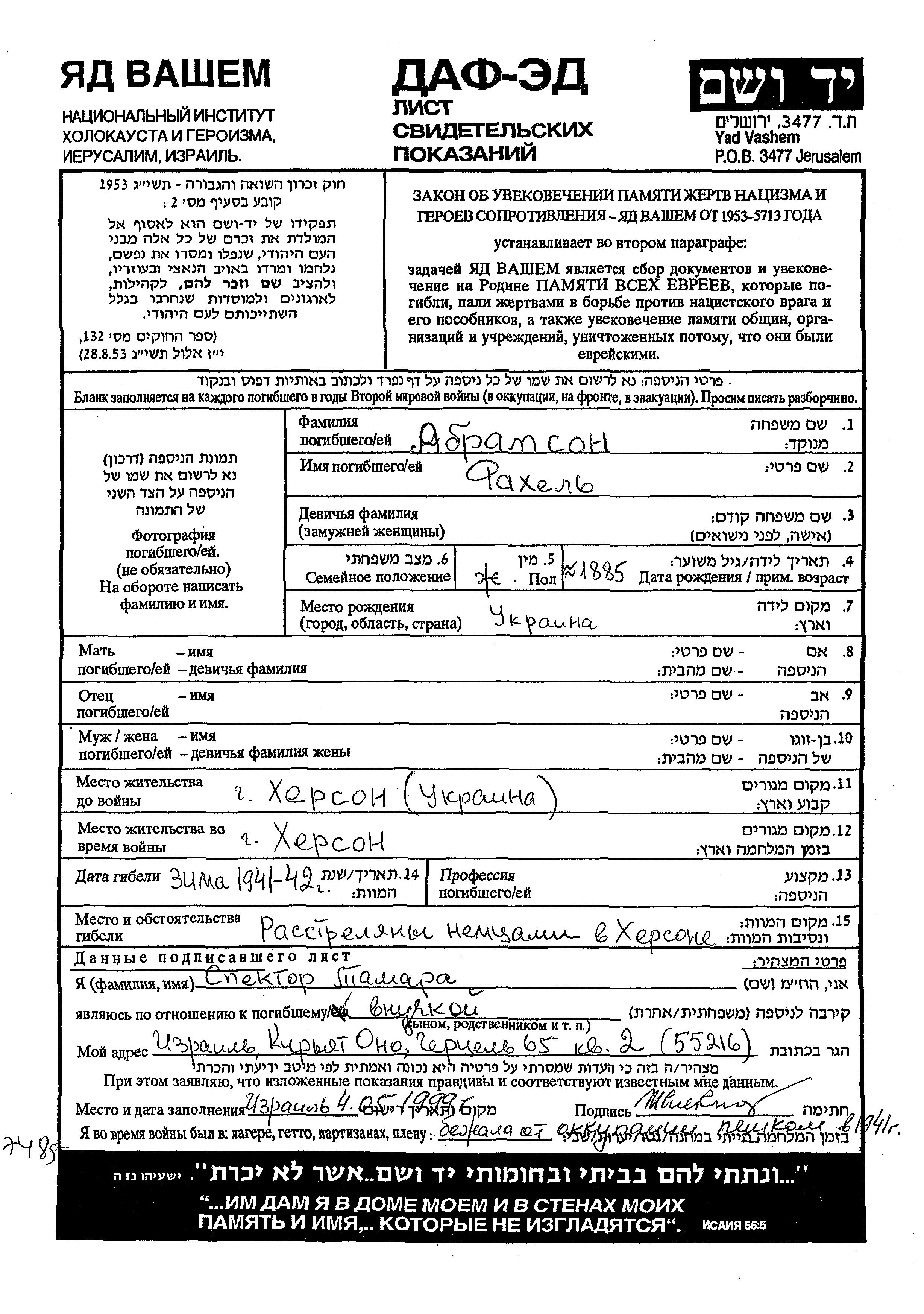 רחל נרצחה בשואה. מקום המוות: Kherson שבאוקראינה (ברה"מ) בשנת 01/1941.