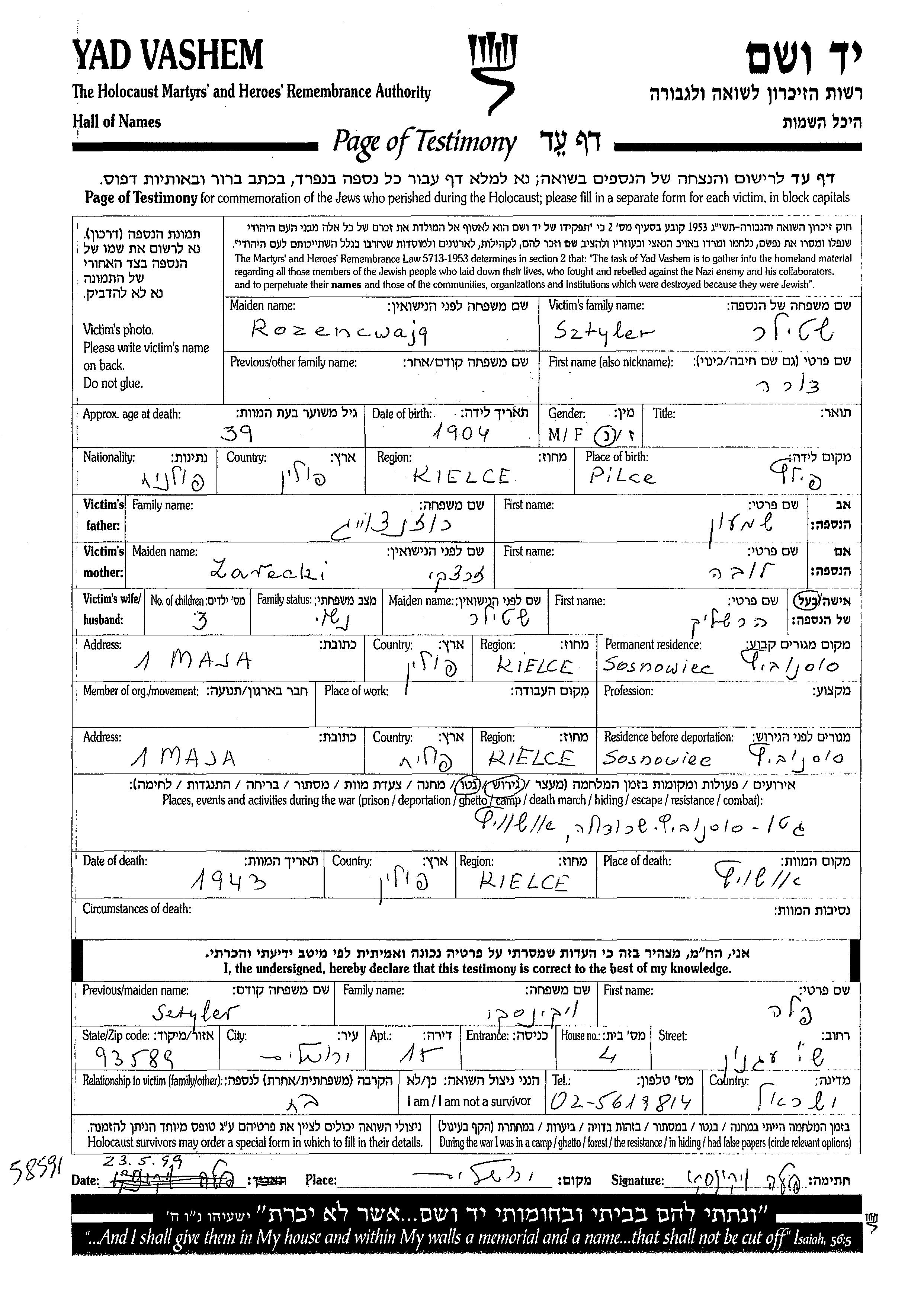 דורה Sztyler לבית Rozencwajg נולדה בPilc שבפולין בשנת 1904 לשמעון ולובה. היא היתה נשואה להרשליק. לפני מלחמת העולם השניה התגוררה בSosnowiec שבפולין. בזמן המלחמה היא היתה בSosnowiec שבפולין.