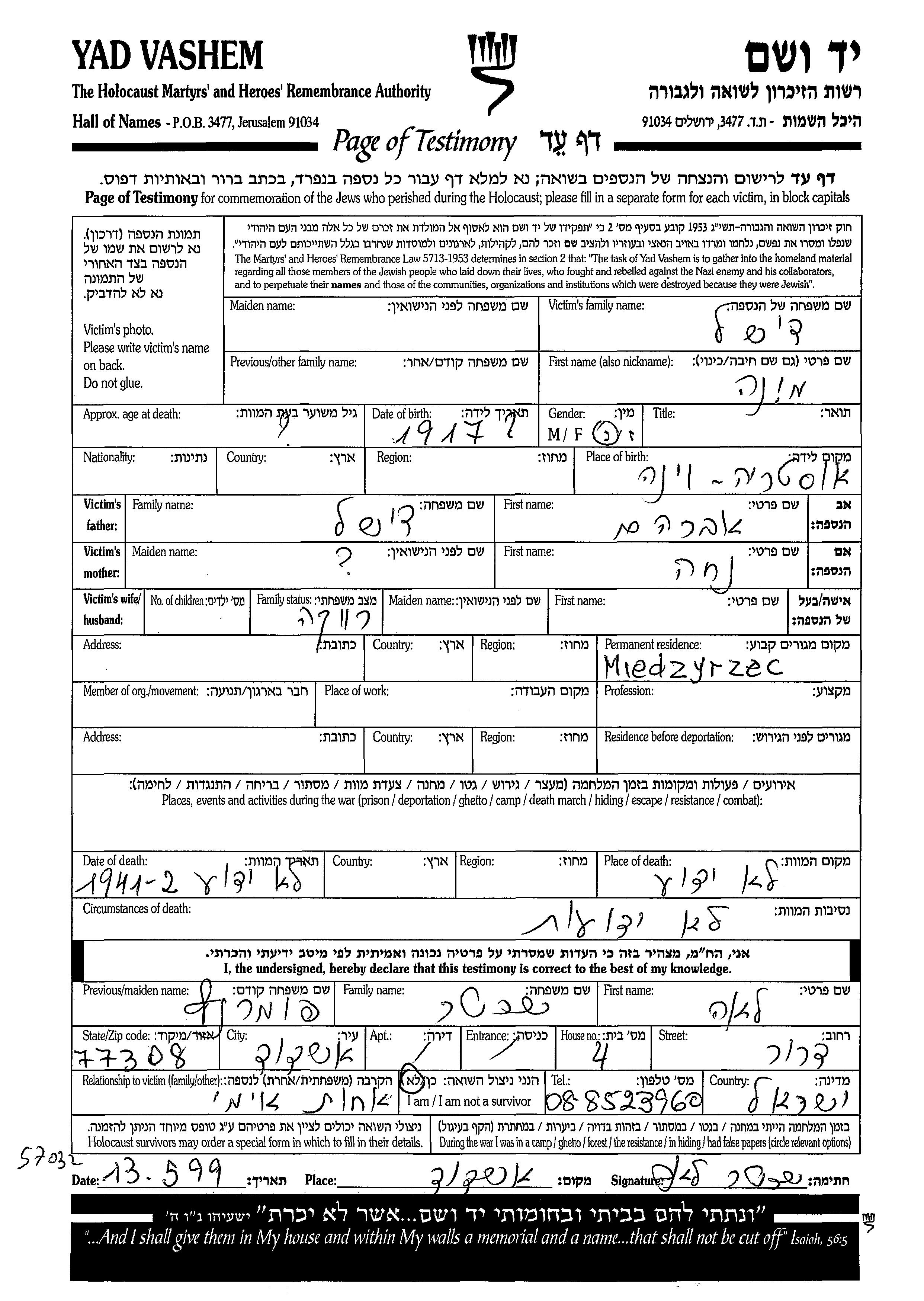 מונה נרצחה בשואה. מקום המוות: לא ידוע בשנת 1941.