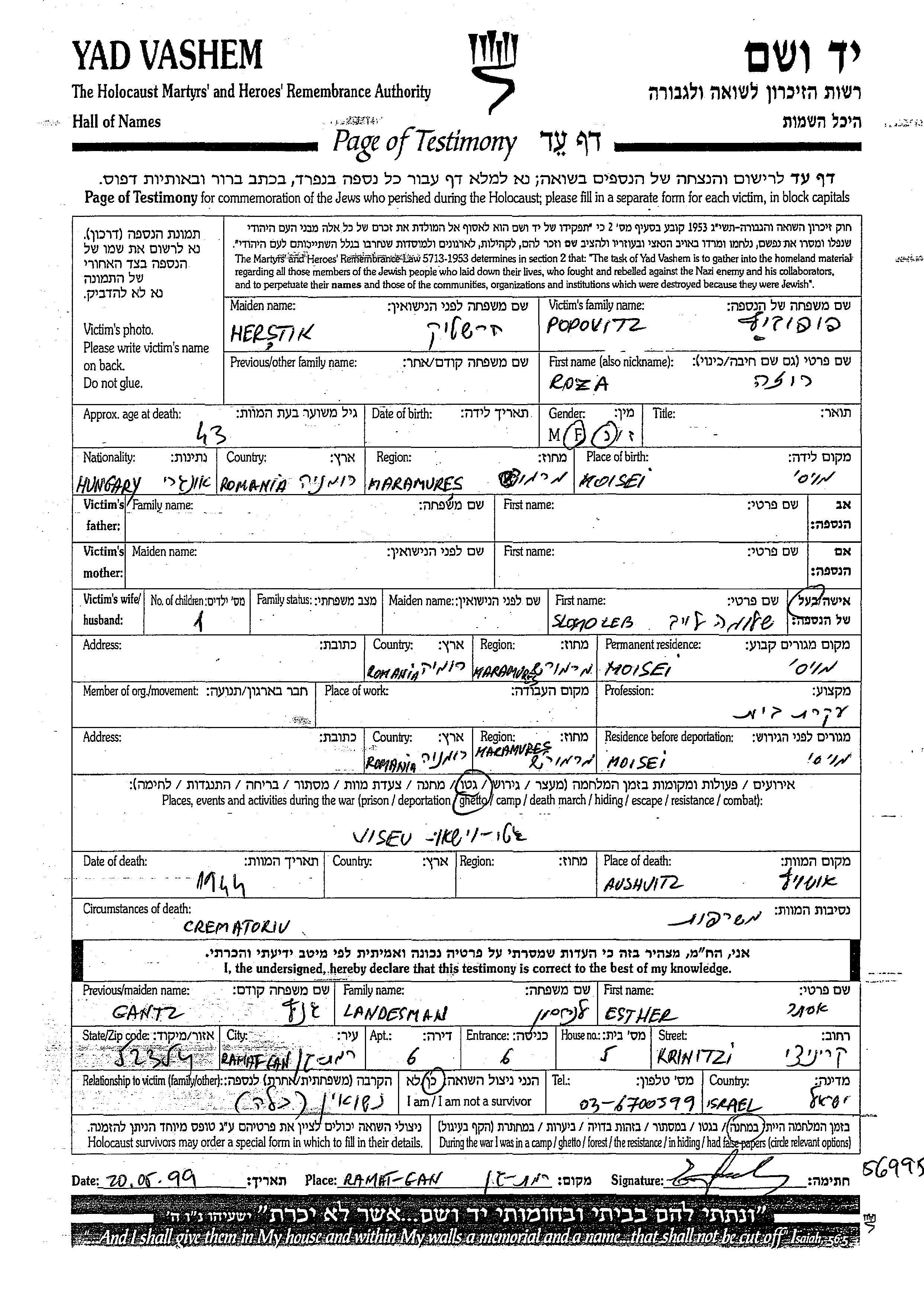 רוזה פופוביץ לבית Herstik נולדה בMoisei שברומניה. היא היתה עקרת בית ונשואה לSlomo Lew. לפני מלחמת העולם השניה התגוררה בMoisei שברומניה. בזמן המלחמה היא היתה בMoisei שברומניה.