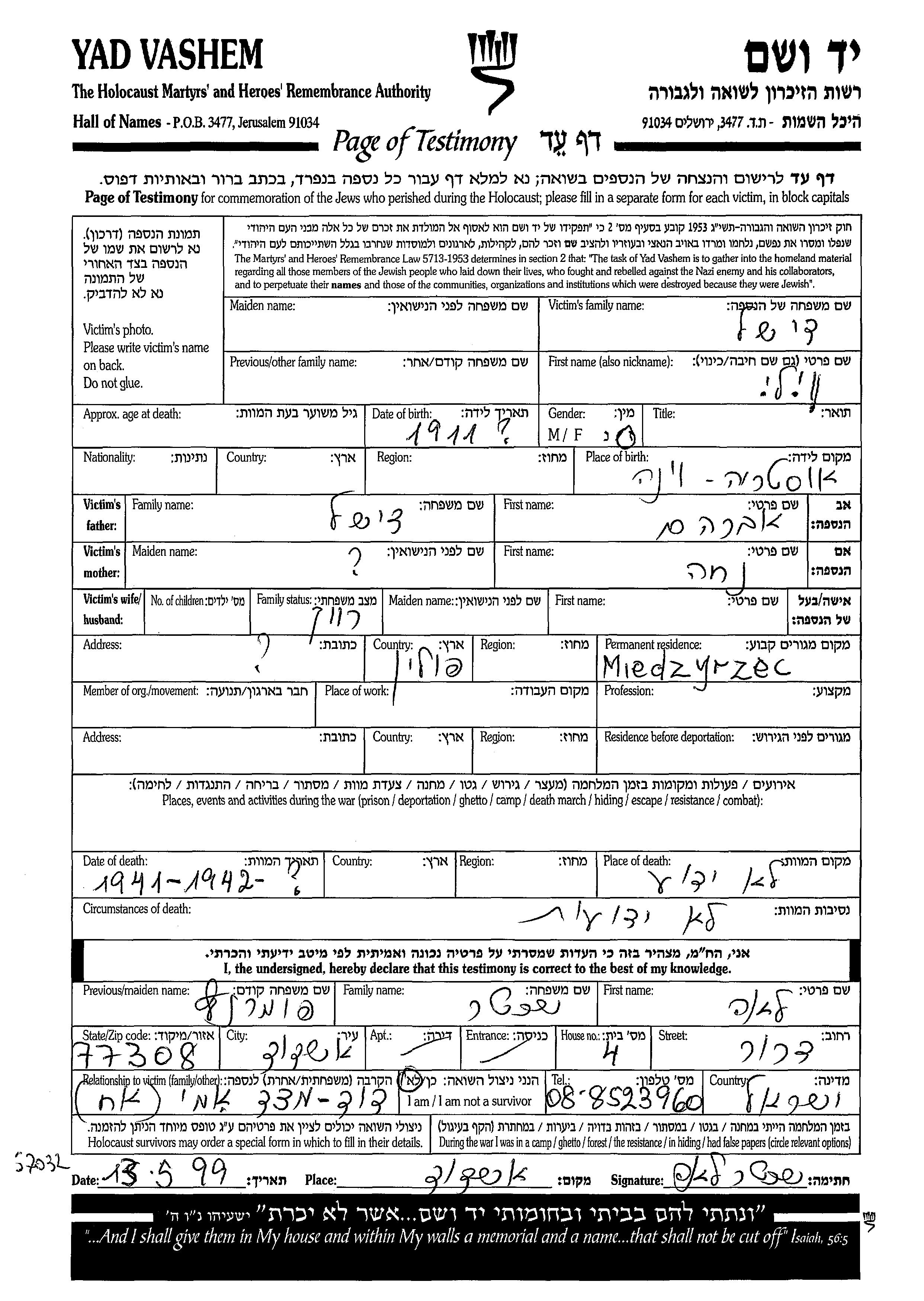 ווילי דישל נולד בWien שבאוסטריה בשנת 1911 לאברהם ונחה. הוא היה רווק. לפני מלחמת העולם השניה התגורר בMiedzyrzec שבפולין. ווילי נרצח בשואה. מקום המוות: לא ידוע בשנת 1941.