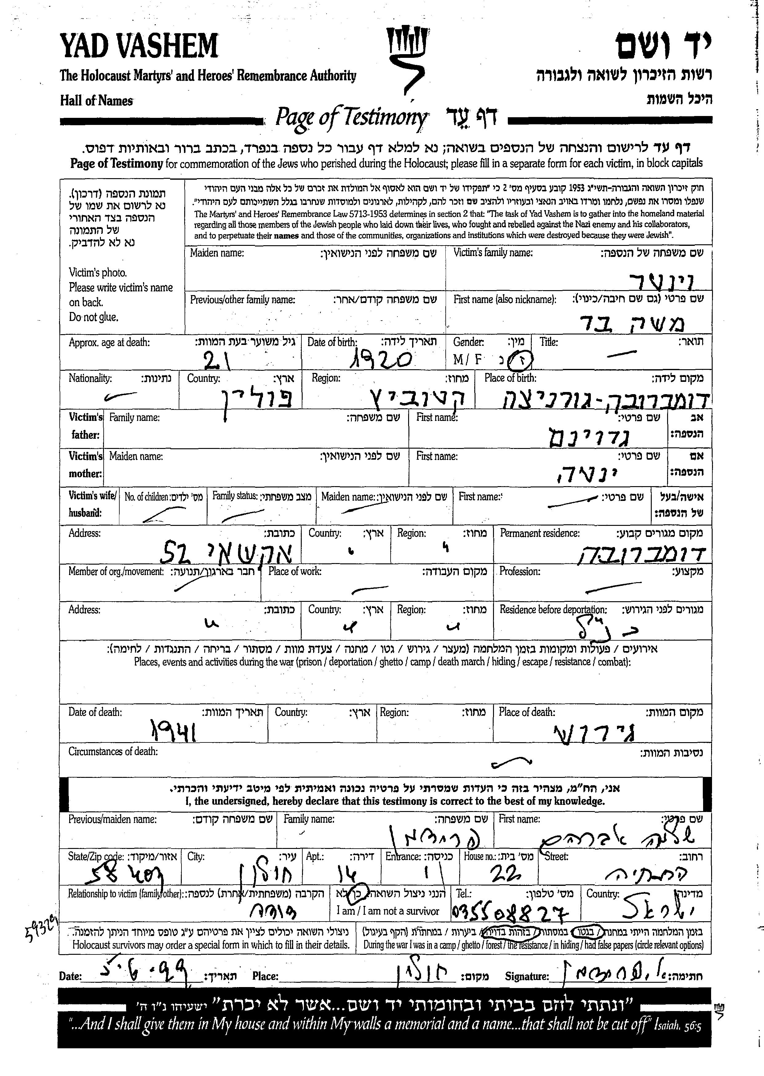 חיפוש שם מוסר דף העד. חיפוש לפי כל שם פרטי, כולל כינוי או שם חיבה