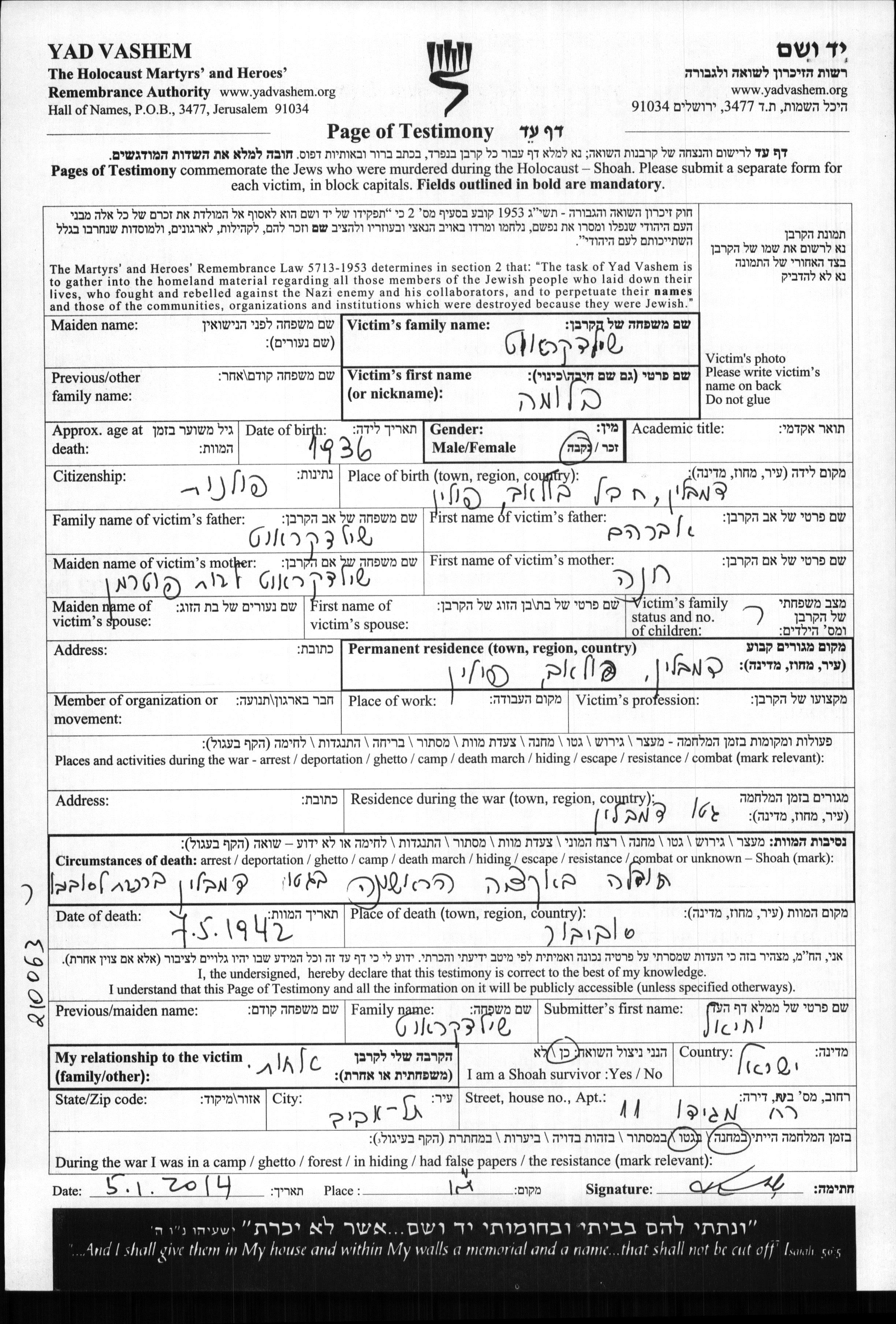 בלומה נרצחה בשואה. מקום המוות: Sobibor שבפולין בשנת 07/05/1942.