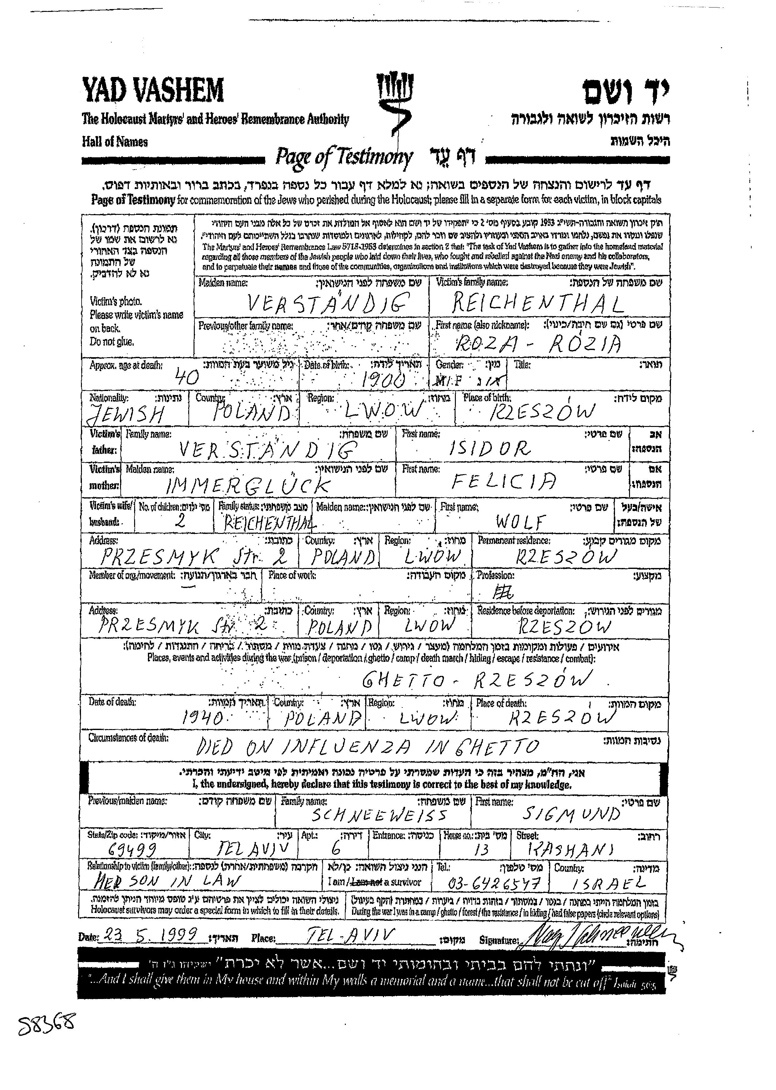 רוזה Reichenthal לבית Verstandig נולדה בRzeszow שבפולין בשנת 1900 לIsidor וFelicia. היא היתה נשואה לWolf. לפני מלחמת העולם השניה התגוררה בRzeszow שבפולין. בזמן המלחמה היא היתה בRzeszow שבפולין.