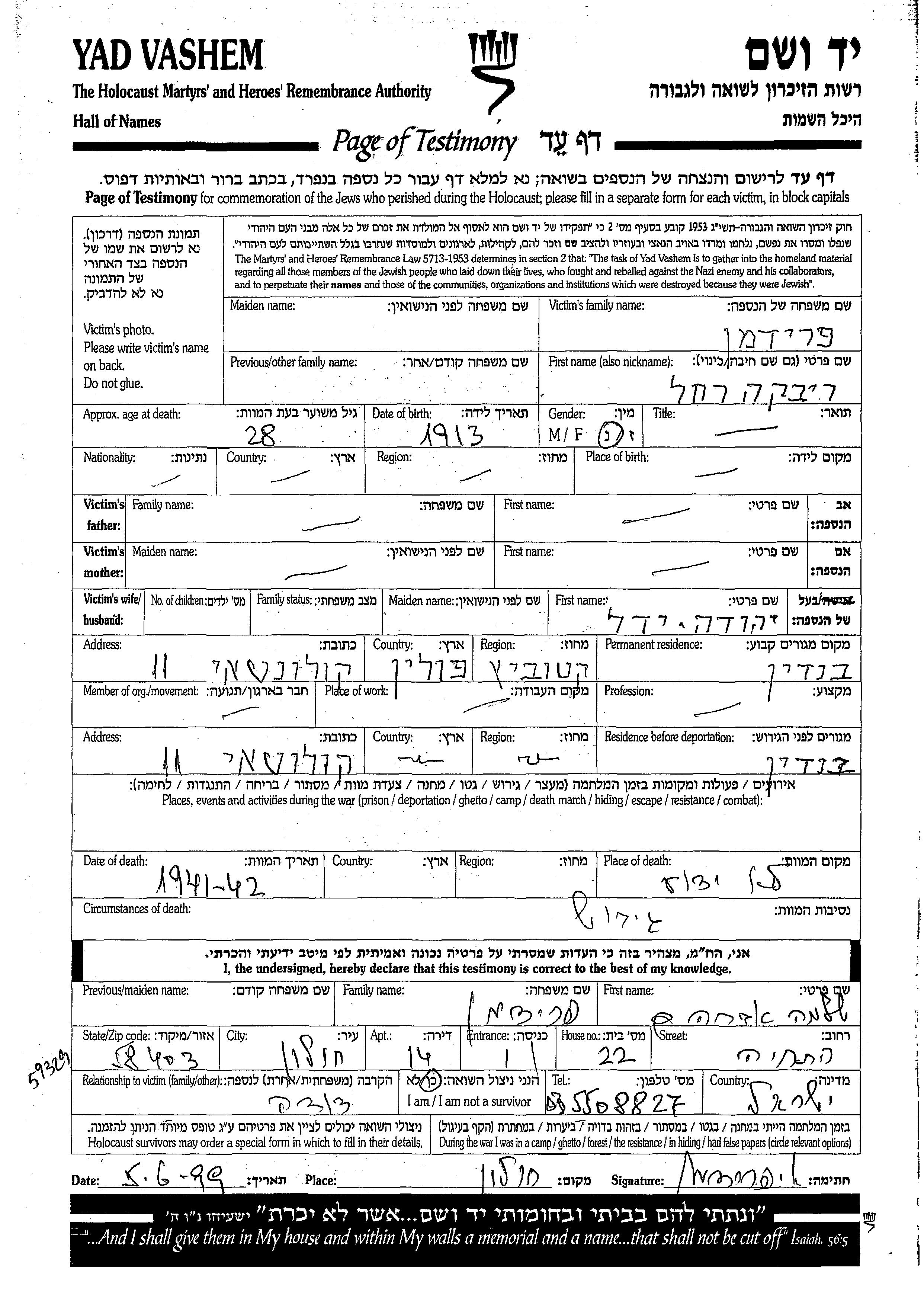 פרידמן רבקה רחל 1913 Bendin, פולין דף-עד